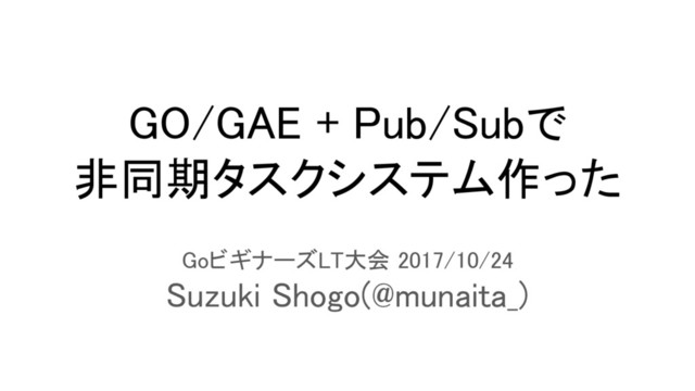 GO/GAE + Pub/Subで 非同期タスクシステム作った GoビギナーズLT大会 2017/10/24 Suzuki Shogo(@munaita_)