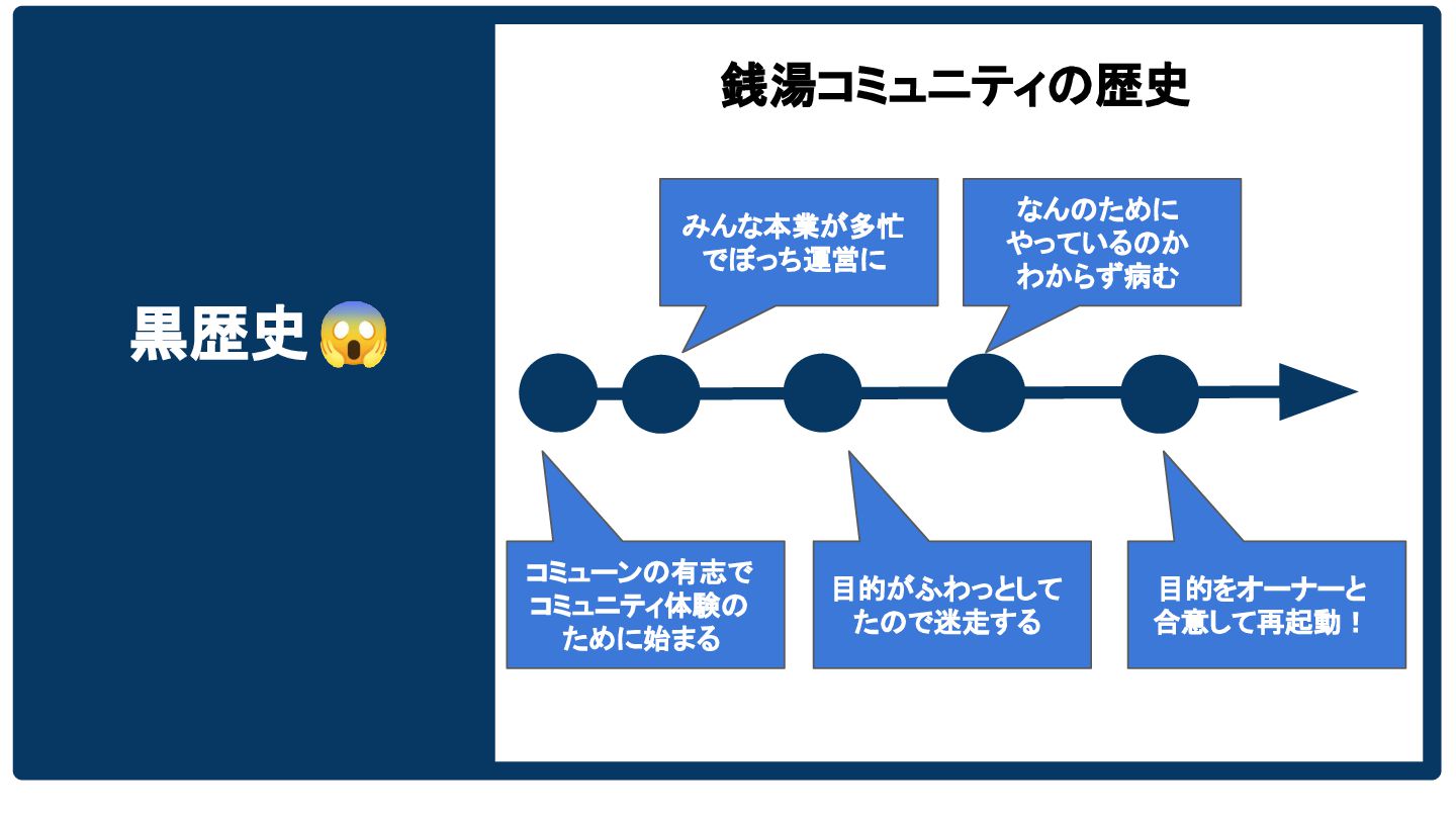 黒歴史😱 銭湯コミュニティの歴史 コミューンの有志で コミュニティ体験の ために始まる みんな本業が多忙 でぼっち運営に 目的がふわっとして たので迷走する なんのために