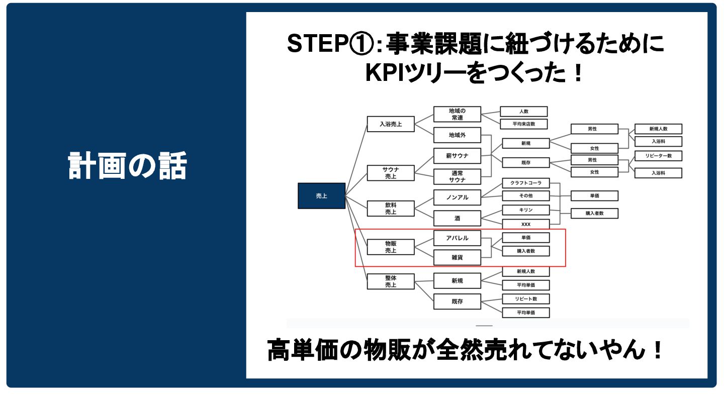 計画の話 STEP①:事業課題に紐づけるために KPIツリーをつくった! 高単価の物販が全然売れてないやん!