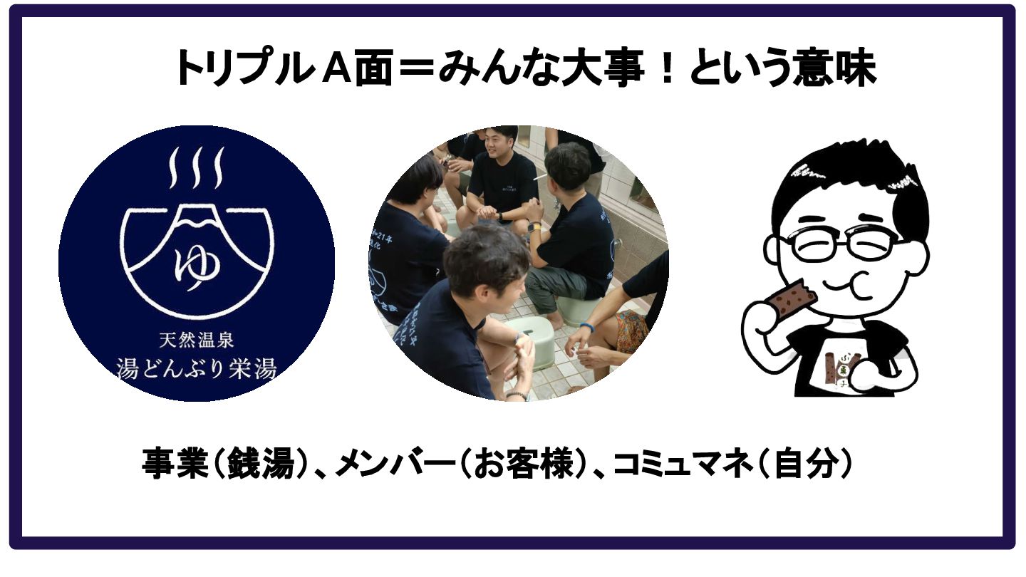 トリプルA面=みんな大事!という意味 事業(銭湯)、メンバー(お客様)、コミュマネ(自分)