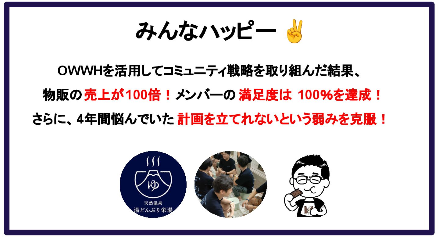 みんなハッピー ✌ OWWHを活用してコミュニティ戦略を取り組んだ結果、 課題だった物販の 売上が100倍! メンバーの 満足度は 100%を達成! さらに、ずっと悩んでいた 計画を立てれないという弱みを克服!