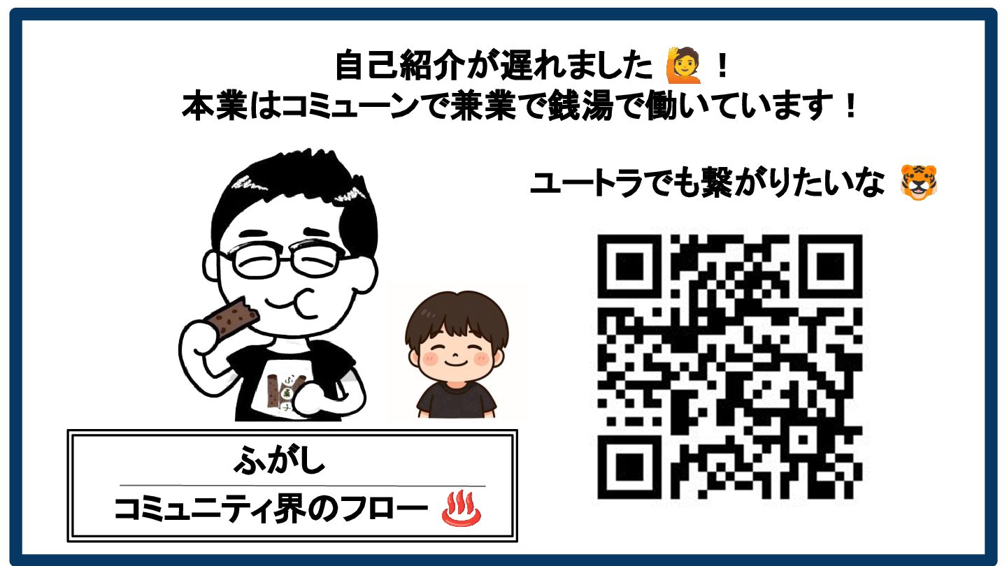 コミュニティ界のフロー ♨ ふがし 自己紹介が遅れました 🙋! 本業はコミューンで兼業で銭湯で働いています! ユートラでも繋がりたいな 🐯