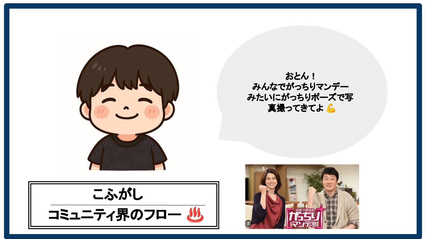 コミュニティ界のフロー ♨ こふがし おとん! みんなでがっちりマンデー みたいにがっちりポーズで写 真撮ってきてよ 💪