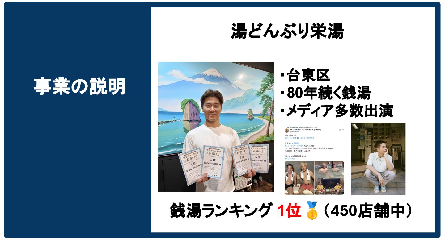 事業の説明 湯どんぶり栄湯 ・台東区 ・80年続く銭湯 ・メディア多数出演 銭湯ランキング 1位🥇(450店舗中)