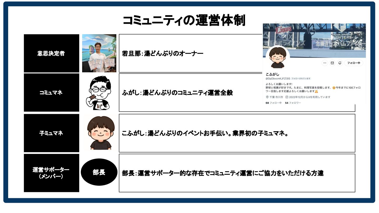 コミュニティ の説明 コミュニティの運営体制 部長 意思決定者 コミュマネ 運営サポーター (メンバー) 子ミュマネ ふがし:湯どんぶりのコミュニティ運営全般