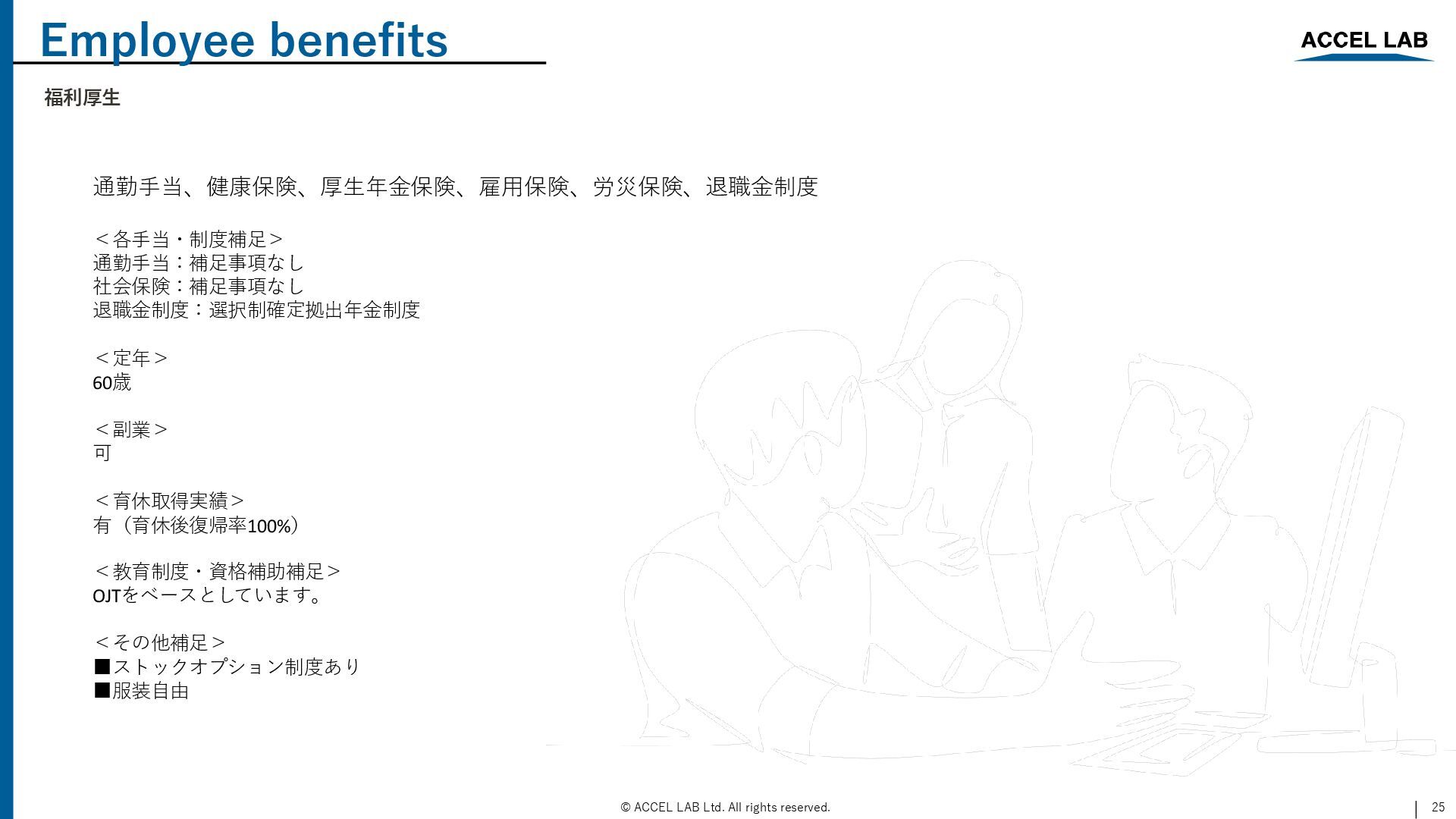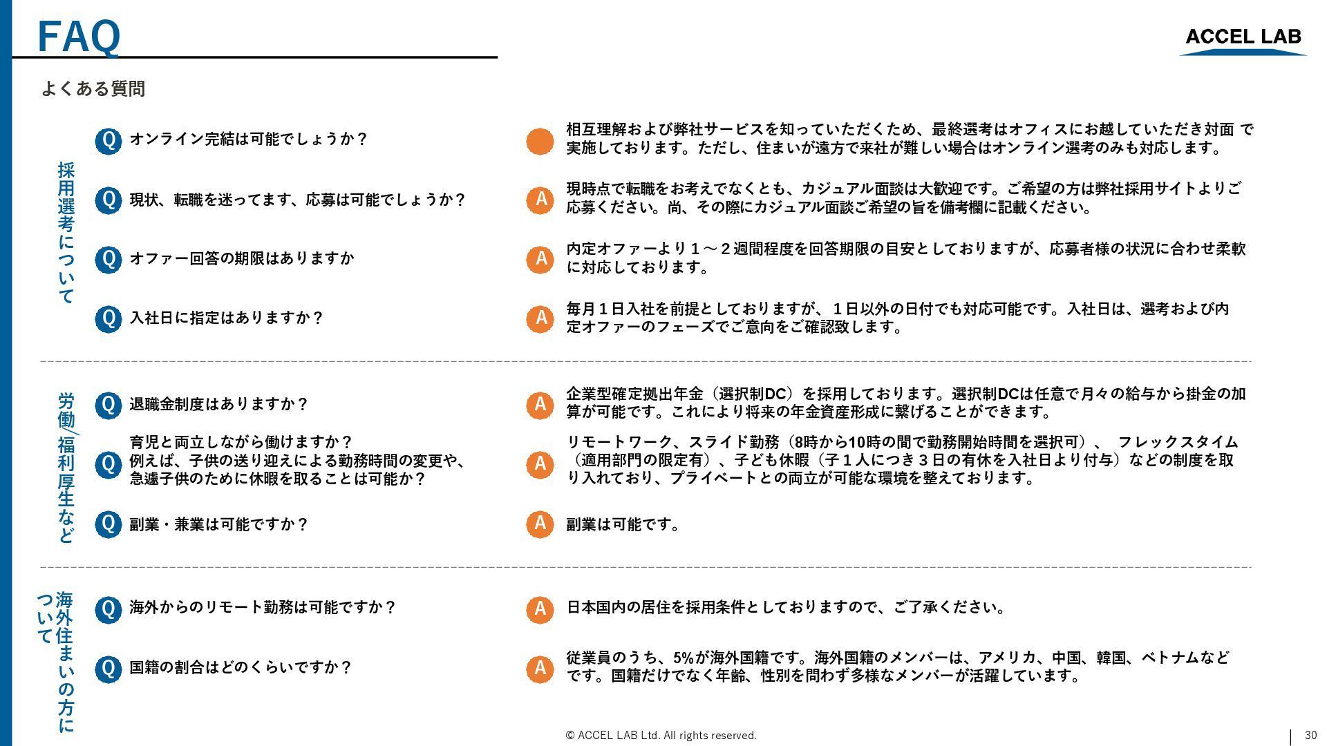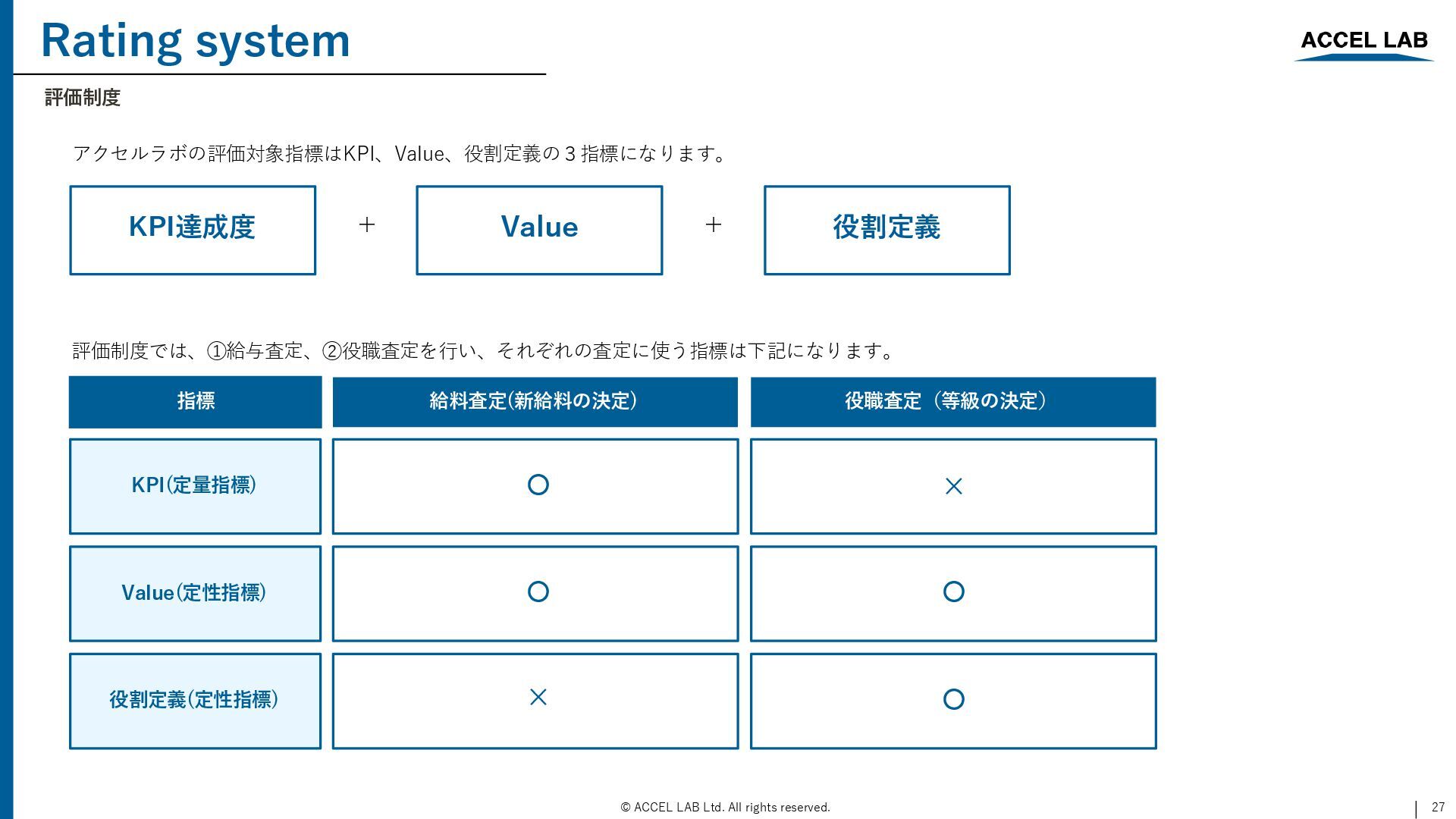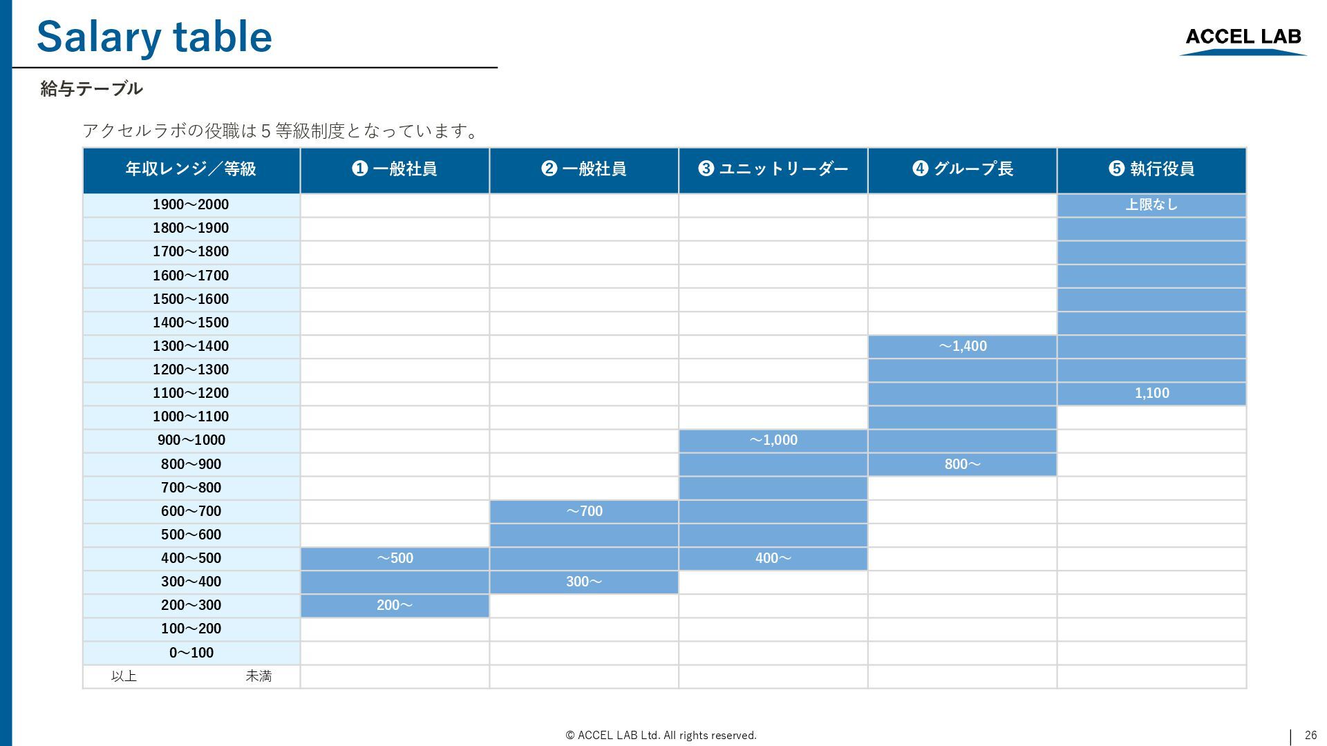 給与テーブル アクセルラボの役職は5等級制度となっています。 年収レンジ/等級 ❶ 一般社員 ❷ 一般社員 ❸ ユニットリーダー ❹ グループ長 ❺ 執行役員 1900~2000 上限なし 1800~1900 1700~1800 1600~1700 1500~1600 1400~1500 1300~1400 ~1,400 1200~1300 1100~1200 1,100 1000~1100 900~1000 ~1,000 800~900 800~ 700~800 600~700 ~700 500~600 400~500 ~500 400~ 300~400 300~ 200~300 200~ 100~200 0~100 以上 未満