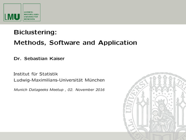 The talk presents an overview of data analysis using biclustering methods from a practical point of view. Real case studies illustrate the use of several biclustering methods. The mathematical theory of one or two methods will be shown in detail and references to technical details of the methods are provided.