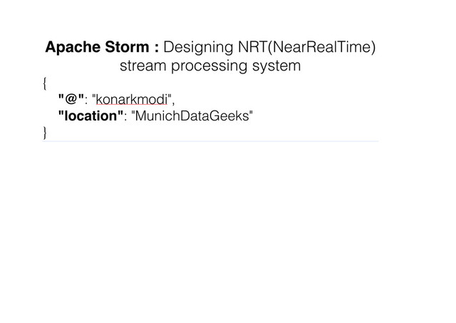Challenges : Scalability: Ingest humdreds of millions of events per minute / day in real time. High degree of robustness Reliable data processing Fault-tolerance : Resilient to software and hardware failures and continue to meet SLA's Low latency : Site facing applications need response times in the order of milliseconds Partioning, Routing, Serialization Meter and gauges to what's going under the hood Control knobs Multi-lang support