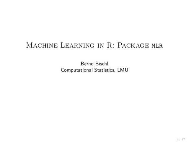 learners, resampling, hyperparameters, . . . Reflections: nearly all objects are queryable (i.e. you can ask them for their properties and program on them) The OO-structure allows many generic algorithms: Bagging Stacking Feature Selection . . . Easily extensible via S3 Extension is not covered here, but explained in detail in the online tutorial You do not need to understand S3 to use mlr Wondering why we don’t use S4? We care about code bloat and speed. 6 / 47