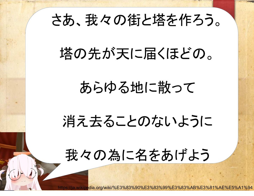 さあ、我々の街と塔を作ろう。 塔の先が天に届くほどの。 あらゆる地に散って 消え去ることのないように 我々の為に名をあげよう https://ja.wikipedia.org/wiki/%E3%83%90%E3%83%99%E3%83%AB%E3%81%AE%E5%A1%94