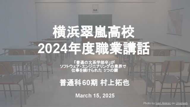 横浜翠嵐高校 2024年度職業講話 「普通 文系学部卒」が ソフトウェア・エンジニアリング 業界で 仕事を続けられた 3つ 鍵 普通科60期