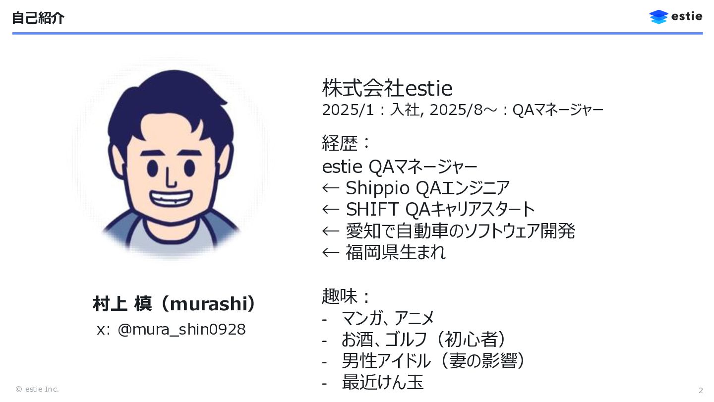 2. © estie Inc. 自己紹介 2 x: @mura_shin0928 経歴: estie QAマネージャー