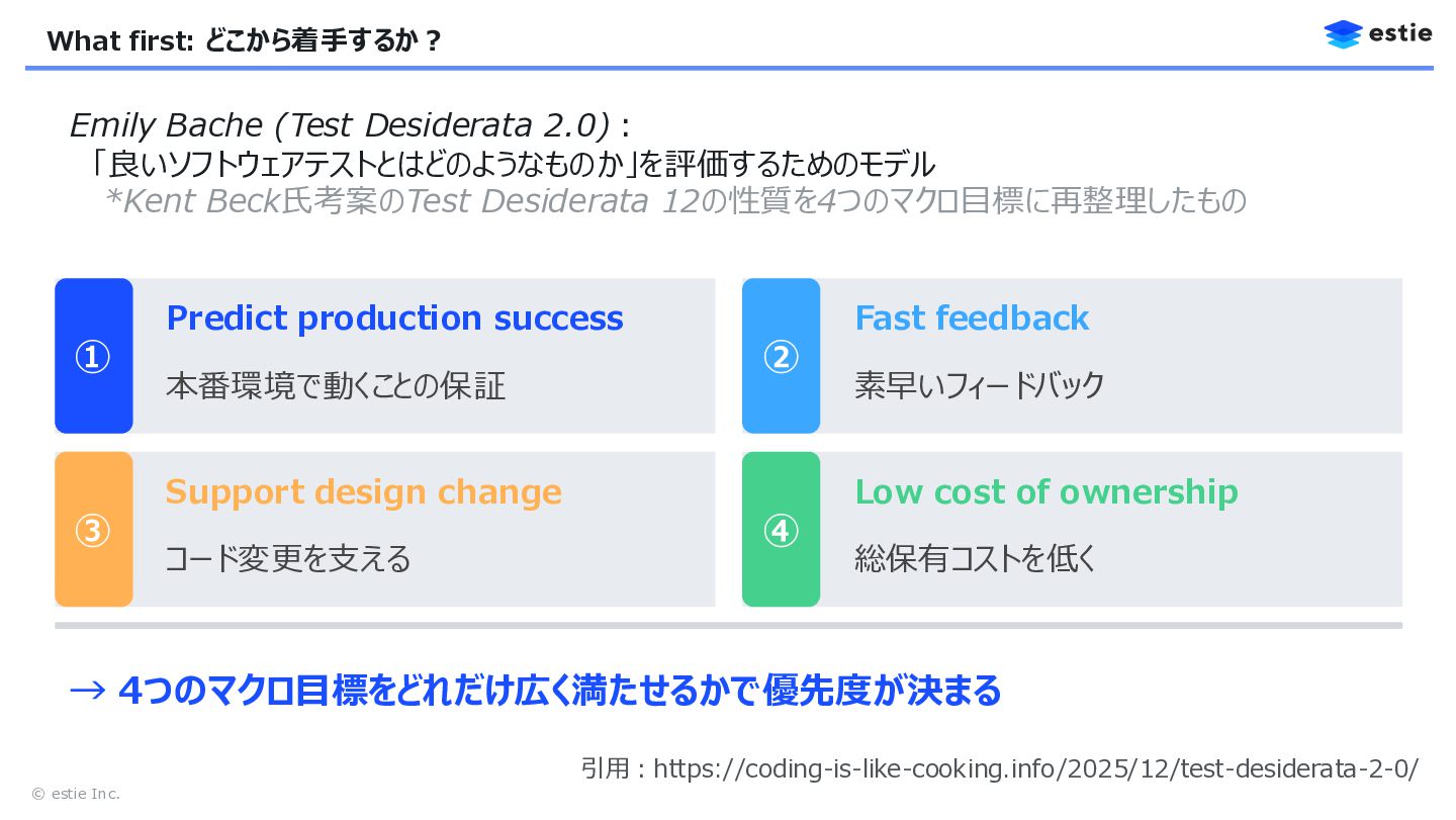 2.0): 「良いソフトウェアテストとはどのようなものか」を評価するためのモデル *Kent Beck考案のTest Desiderata 12の性質を4つのマクロ目標に再整理したもの ① Predict production success 本番環境で動く保証 ② Fast feedback 素早いフィードバック ③ Support design change コード変更を支える ④ Low cost of ownership 総保有コストを低く → 4つのマクロ目標をどれだけ広く満たせるかで優先度が決まる 引用:https://coding-is-like-cooking.info/2025/12/test-desiderata-2-0/