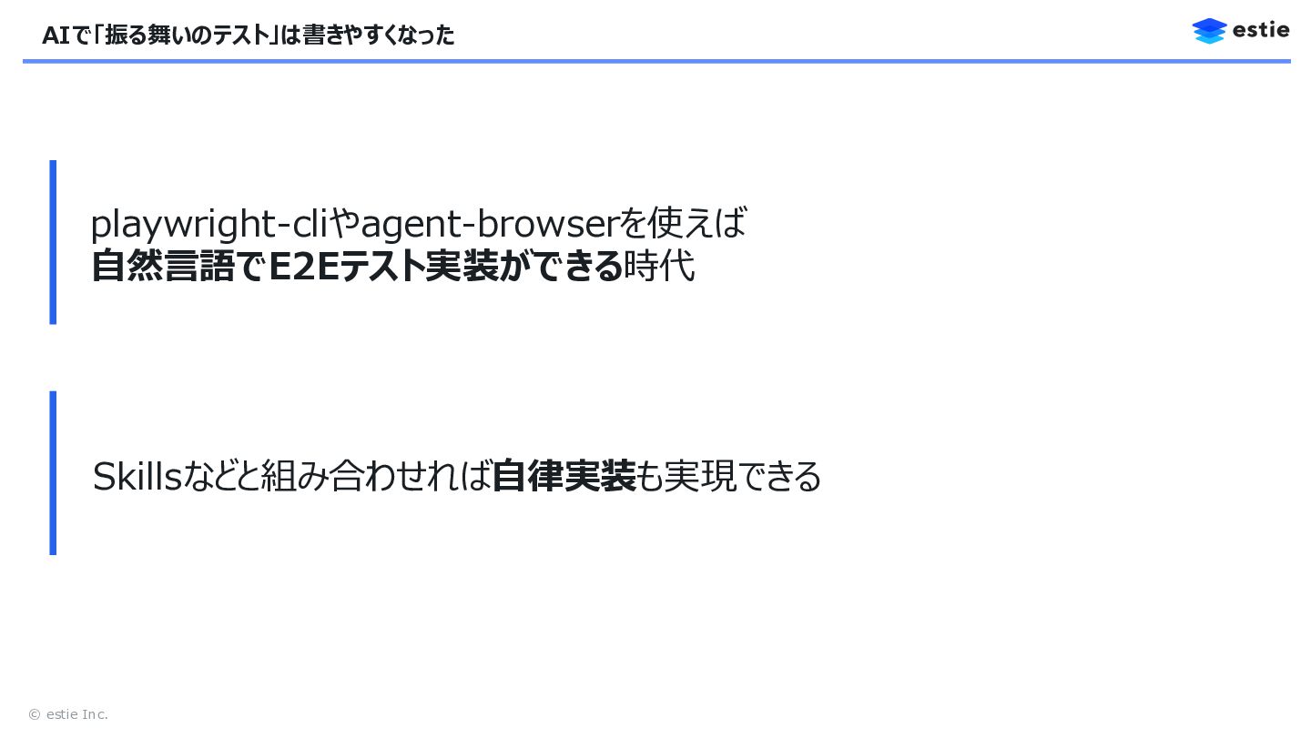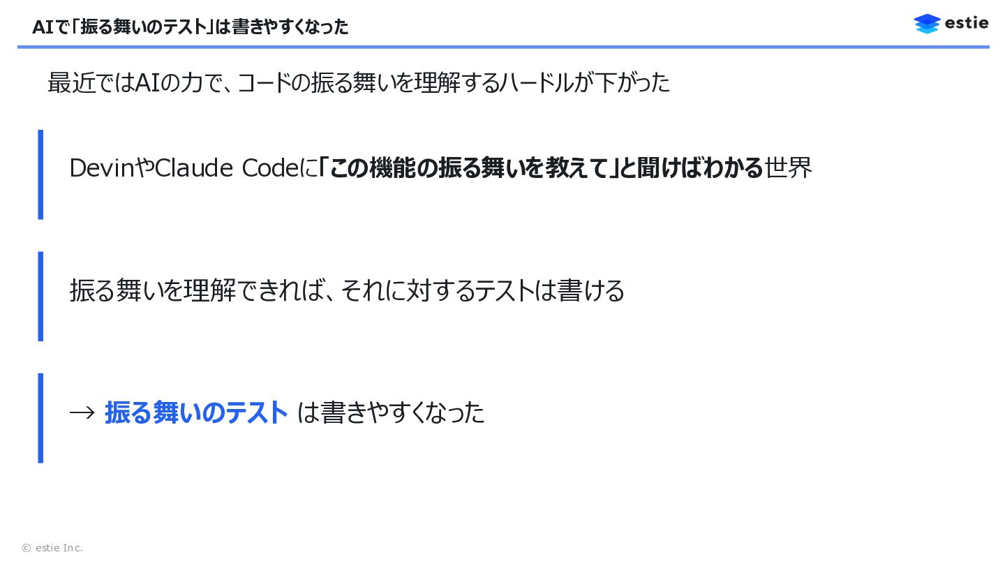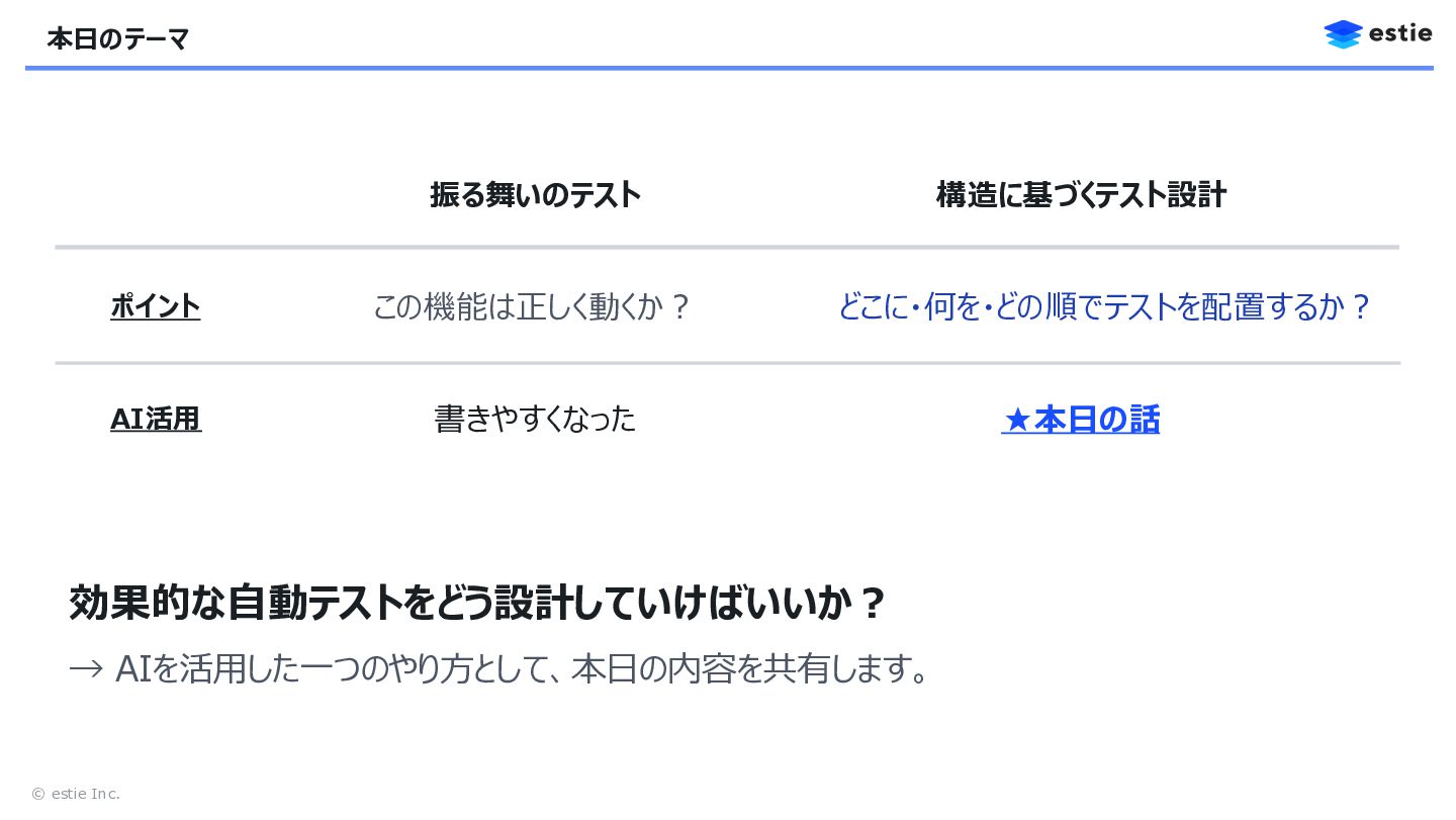 3. © estie Inc. 本日のテーマ 振る舞いのテスト 構造に基づくテスト設計 ポイント この機能は正しく動くか? どこに・何を・どの順でテストを配置するか? AI活用