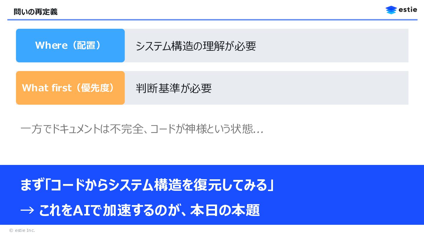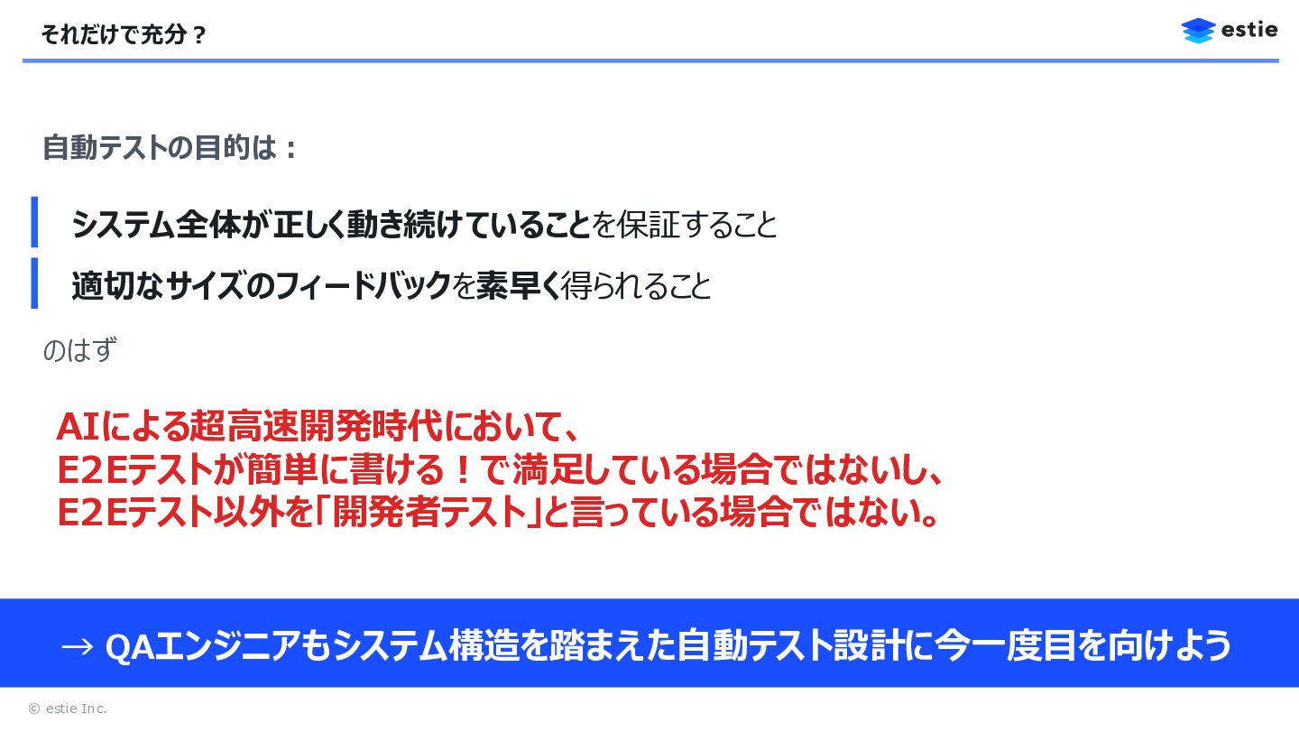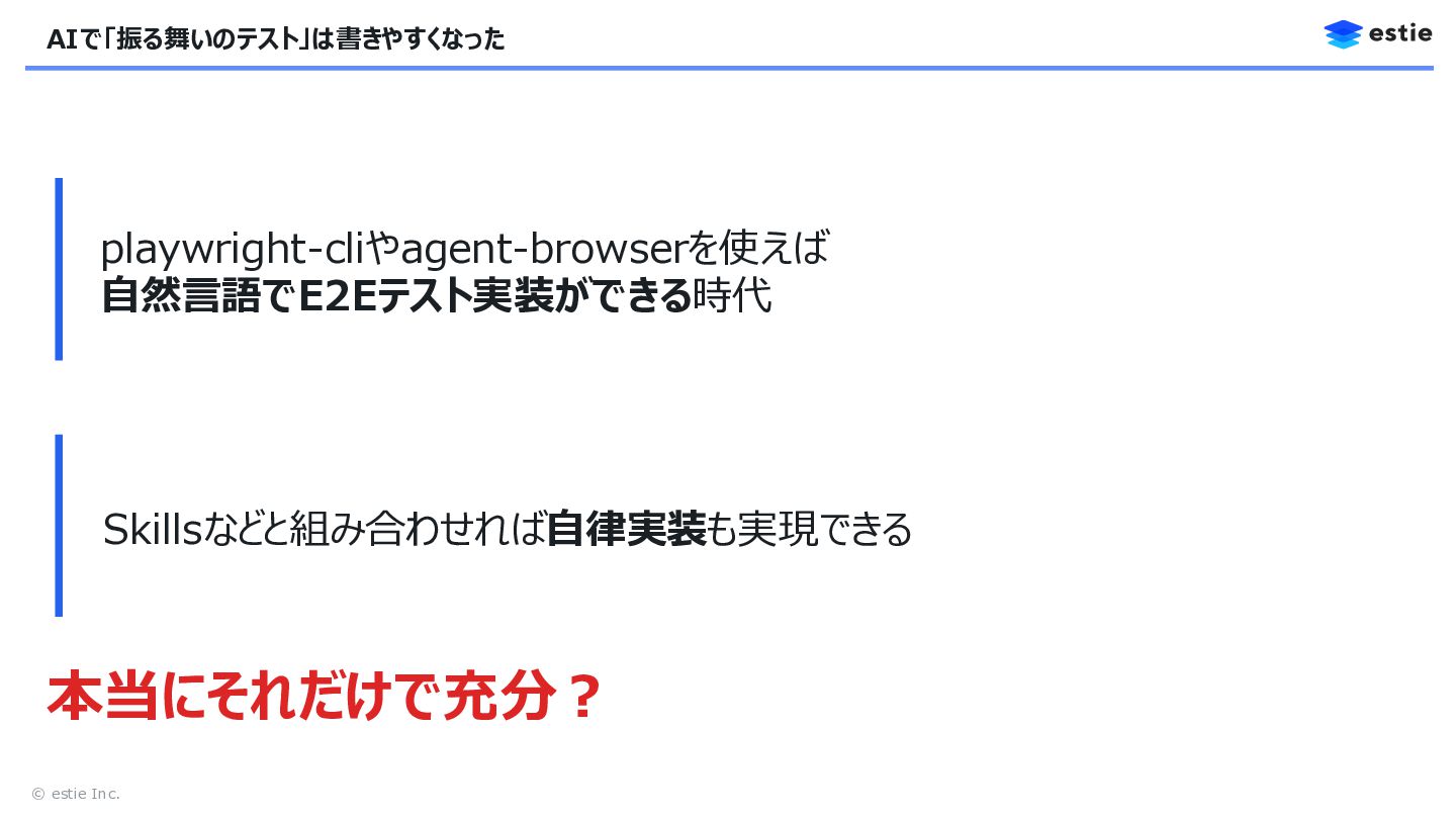3. © estie Inc. 本日のテーマ 振る舞いのテスト 構造に基づくテスト設計 ポイント この機能は正しく動くか? どこに・何を・どの順でテストを配置するか? AI活用