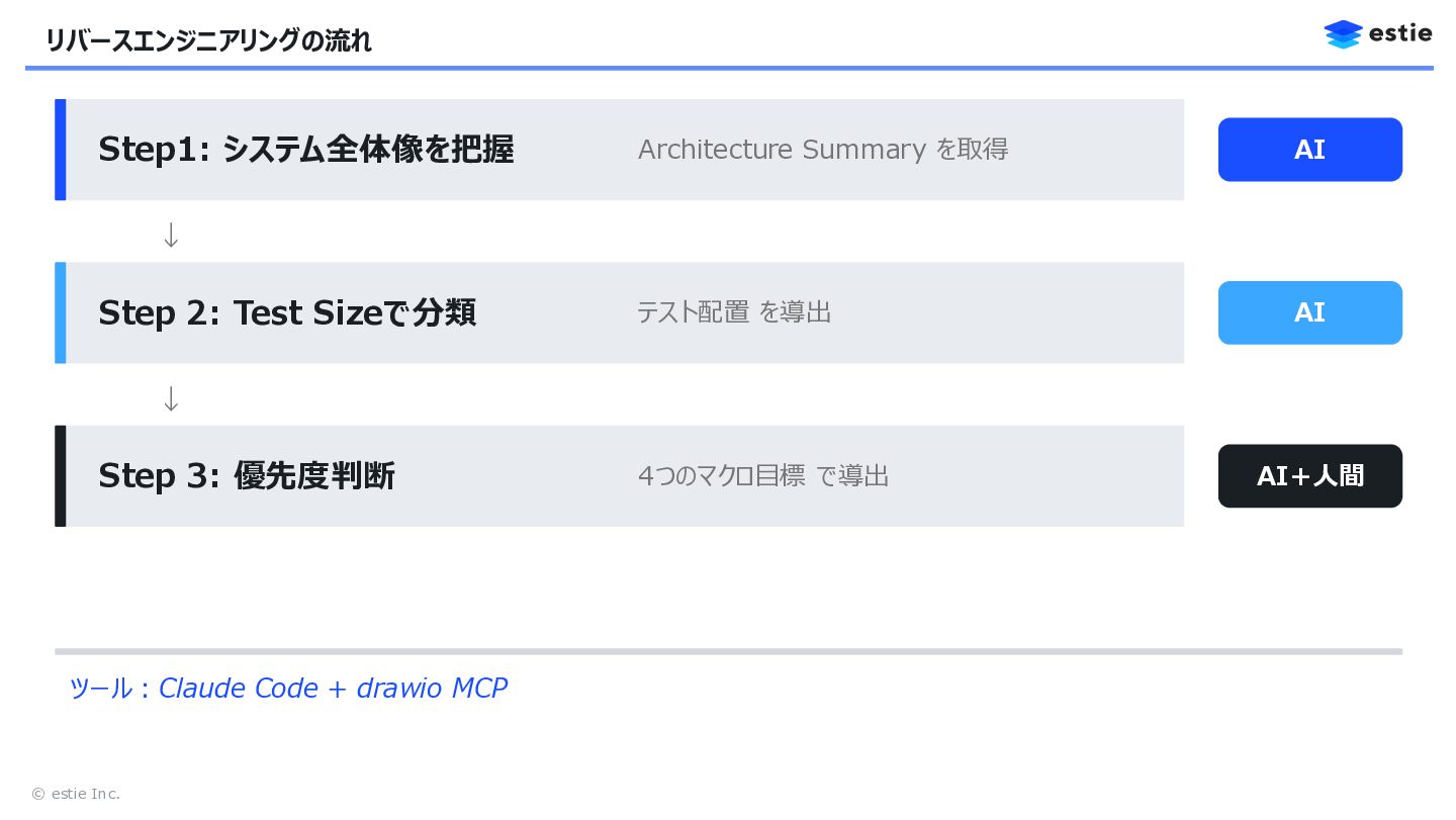 ↓ Step 2: Test Sizeで分類 テスト配置 を導出 AI ↓ Step 3: 優先度判断 4つのマクロ目標 で導出 AI+人間 ツール:Claude Code + drawio MCP