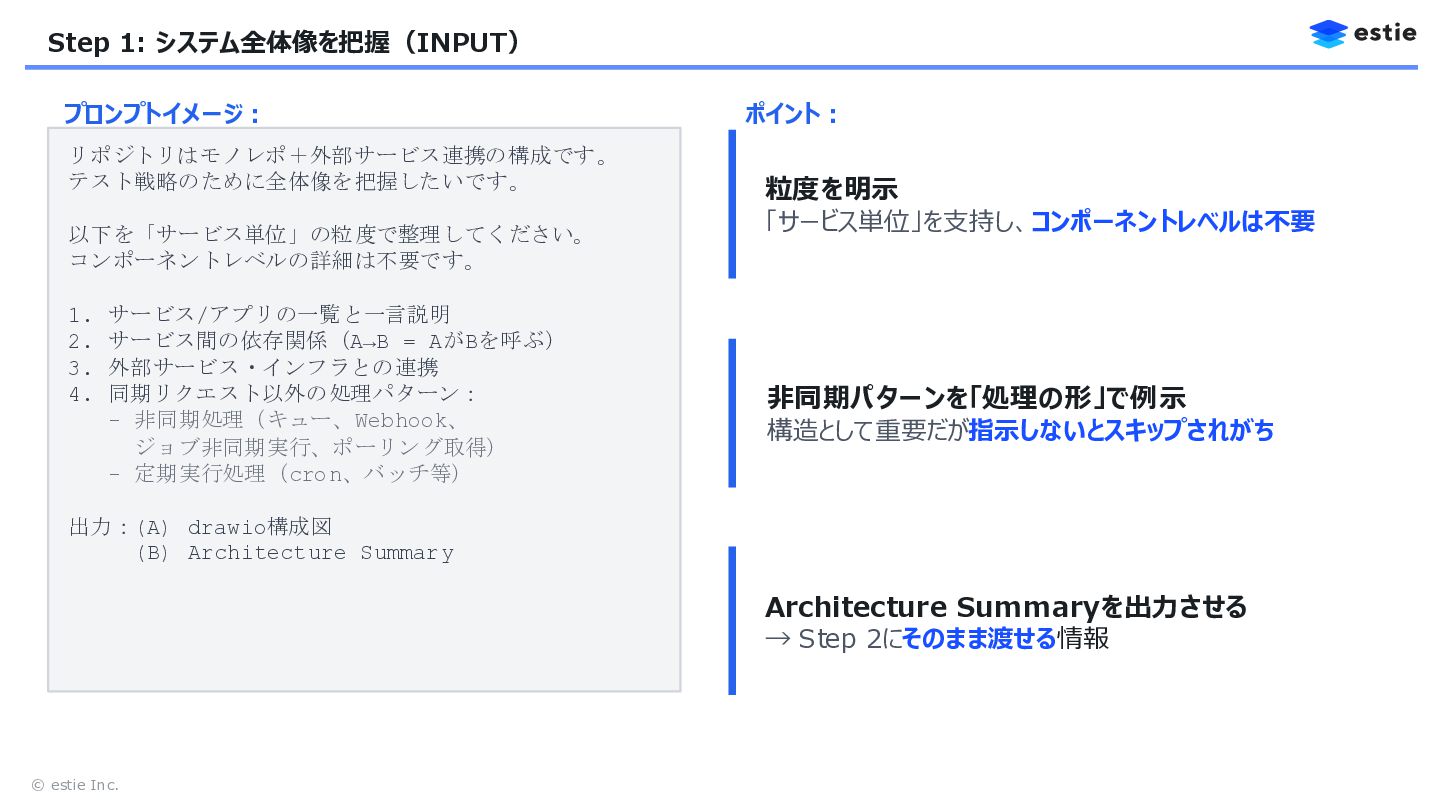 7. © estie Inc. Step 1: システム全体像を把握(INPUT) プロンプトイメージ: リポジトリはモノレポ+外部サービス連携の構成です。 テスト戦略のために全体像を把握したいです。 以下を「サービス単位」の粒度で整理してください。