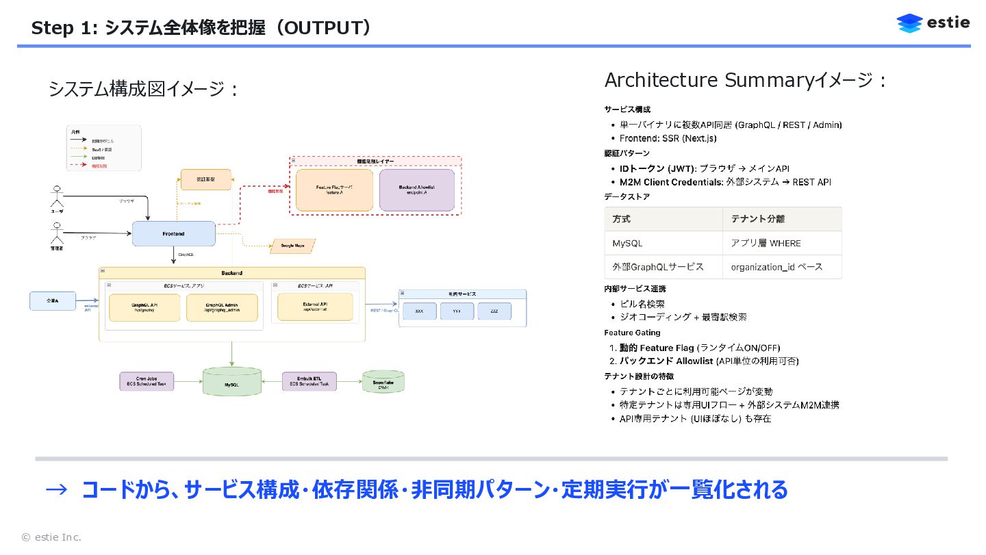 コンポーネントレベルの詳細は不要です。 1. サービス/アプリの一覧と一言説明 2. サービス間の依存関係(A→B = AがBを呼ぶ) 3. 外部サービス・インフラとの連携 4. 同期リクエスト以外の処理パターン: - 非同期処理(キュー、Webhook、 ジョブ非同期実行、ポーリング取得) - 定期実行処理(cron、バッチ等) 出力:(A) drawio構成図 (B) Architecture Summary ポイント: 粒度を明示 「サービス単位」を支持し、コンポーネントレベルは不要 非同期パターンを「処理の形」で例示 構造として重要だが指示しないとスキップされがち Architecture Summaryを出力させる → Step 2にそのまま渡せる情報