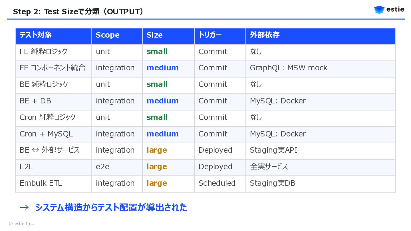 トリガー 外部依存 FE 純粋ロジック unit small Commit なし FE コンポーネント統合 integration medium Commit GraphQL: MSW mock BE 純粋ロジック unit small Commit なし BE + DB integration medium Commit MySQL: Docker Cron 純粋ロジック unit small Commit なし Cron + MySQL integration medium Commit MySQL: Docker BE 外部サービス integration large Deployed Staging実API E2E e2e large Deployed 全実サービス Embulk ETL integration large Scheduled Staging実DB → システム構造からテスト配置が導出された