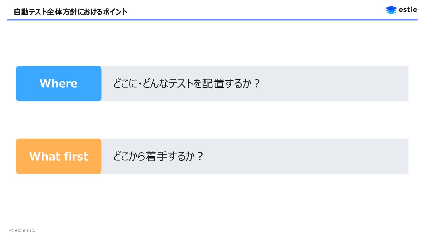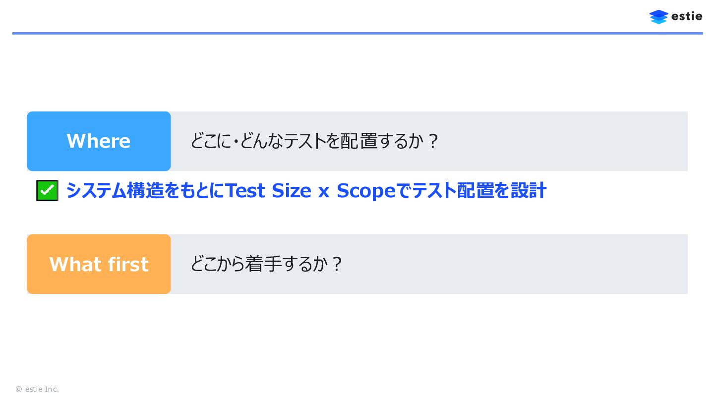 13. © estie Inc. Where どこに・どんなテストを配置するか? What first どこから着手するか? システム構造をもとにTest Size
