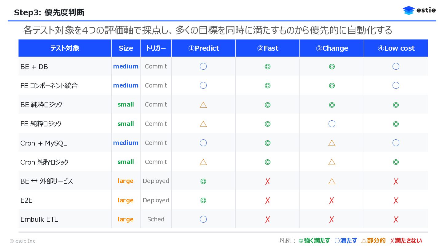 ③Change ④Low cost BE + DB medium Commit ◦ ◎ ◎ ◦ FE コンポーネント統合 medium Commit ◦ ◎ ◎ ◦ BE 純粋ロジック small Commit △ ◎ ◎ ◎ FE 純粋ロジック small Commit △ ◎ ◦ ◎ Cron + MySQL medium Commit ◦ ◎ △ ◦ Cron 純粋ロジック small Commit △ ◎ △ ◎ BE 外部サービス large Deployed ◎ ✗ △ ✗ E2E large Deployed ◎ ✗ ✗ ✗ Embulk ETL large Sched ◦ ✗ ✗ ✗ 凡例:◎強く満たす ◦満たす △部分的 ✗満たさない 各テスト対象を4つの評価軸で採点し、多くの目標を同時に満たすものから優先的に自動化する