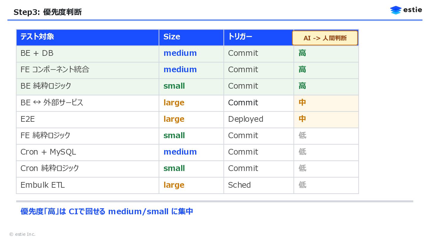 + DB medium Commit 高 FE コンポーネント統合 medium Commit 高 BE 純粋ロジック small Commit 高 BE 外部サービス large Commit 中 E2E large Deployed 中 FE 純粋ロジック small Commit 低 Cron + MySQL medium Commit 低 Cron 純粋ロジック small Commit 低 Embulk ETL large Sched 低 優先度「高」は CIで回せる medium/small に集中 AI -> 人間判断