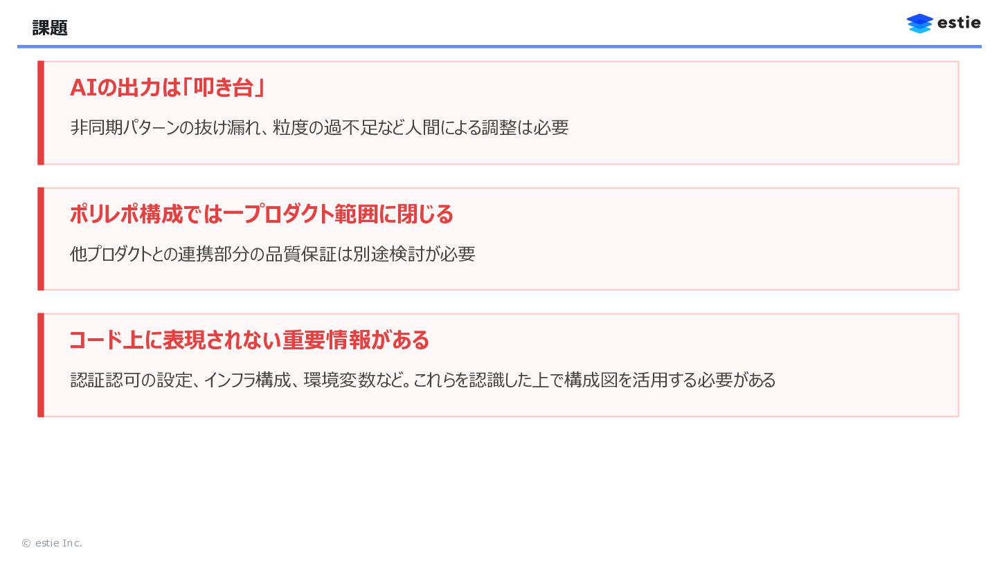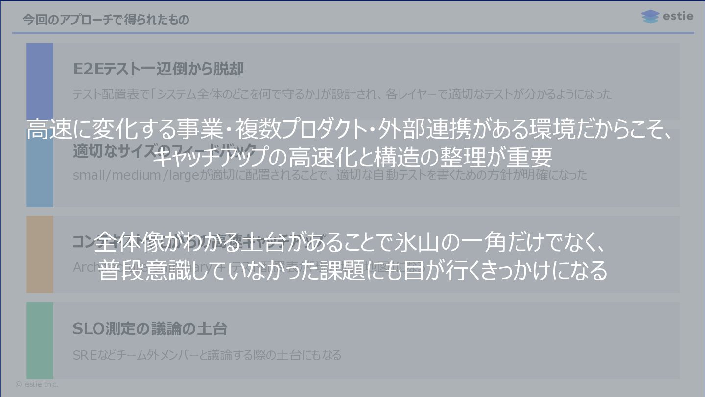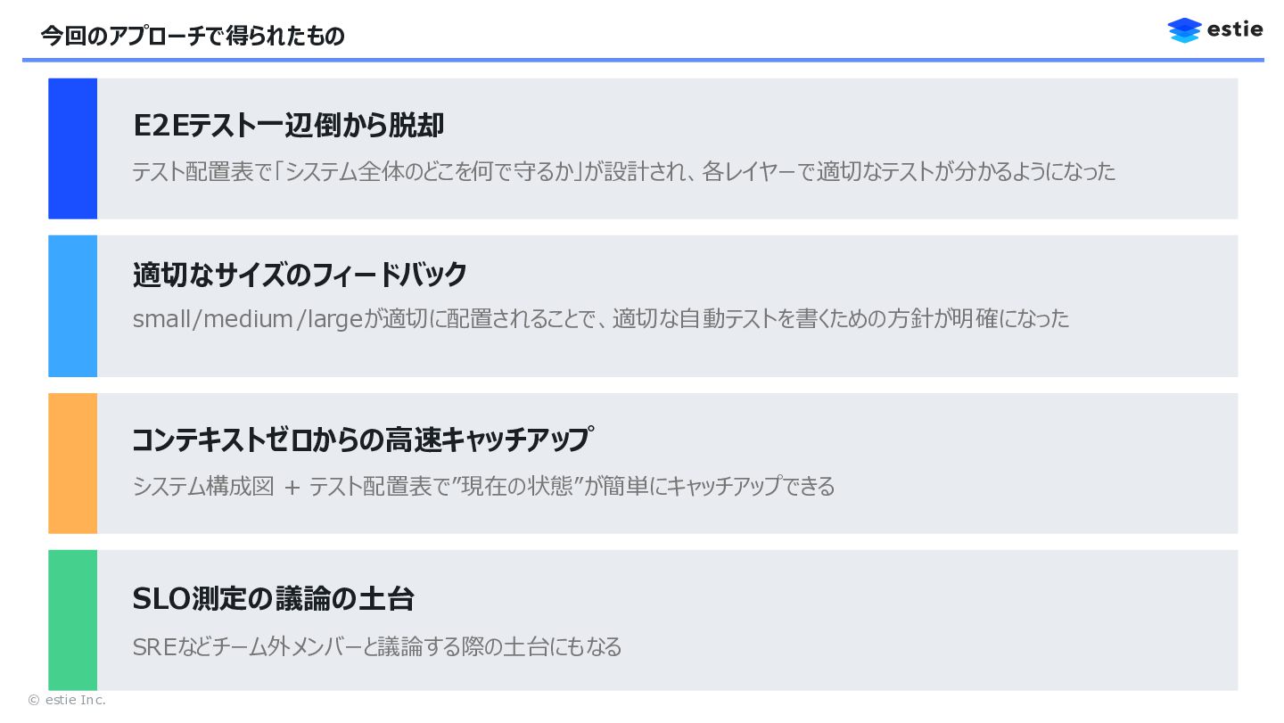 14. © estie Inc. 今回のアプローチで得られたもの E2Eテスト一辺倒から脱却 テスト配置表で「システム全体のどこを何で守るか」が設計され、各レイヤーで適切なテストが分かるようになった 適切なサイズのフィードバック small/medium/largeが適切に配置されることで、適切な自動テストを書くための方針が明確になった コンテキストゼロからの高速キャッチアップ Architecture