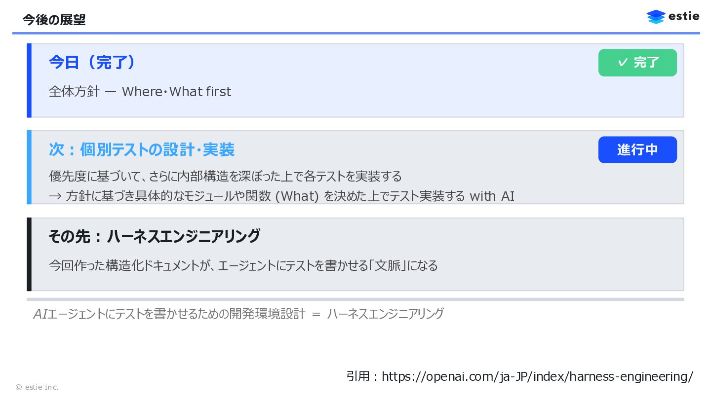first 次:個別テストの設計・実装 優先度に基づいて、さらに内部構造を深ぼった上で各テストを実装する → 方針に基づき具体的なモジュールや関数 (What) を決めた上でテスト実装する with AI その先:ハーネスエンジニアリング 今回作った構造化ドキュメントが、エージェントにテストを書かせる「文脈」になる AIエージェントにテストを書かせるための開発環境設計 = ハーネスエンジニアリング 進行中 引用:https://openai.com/ja-JP/index/harness-engineering/