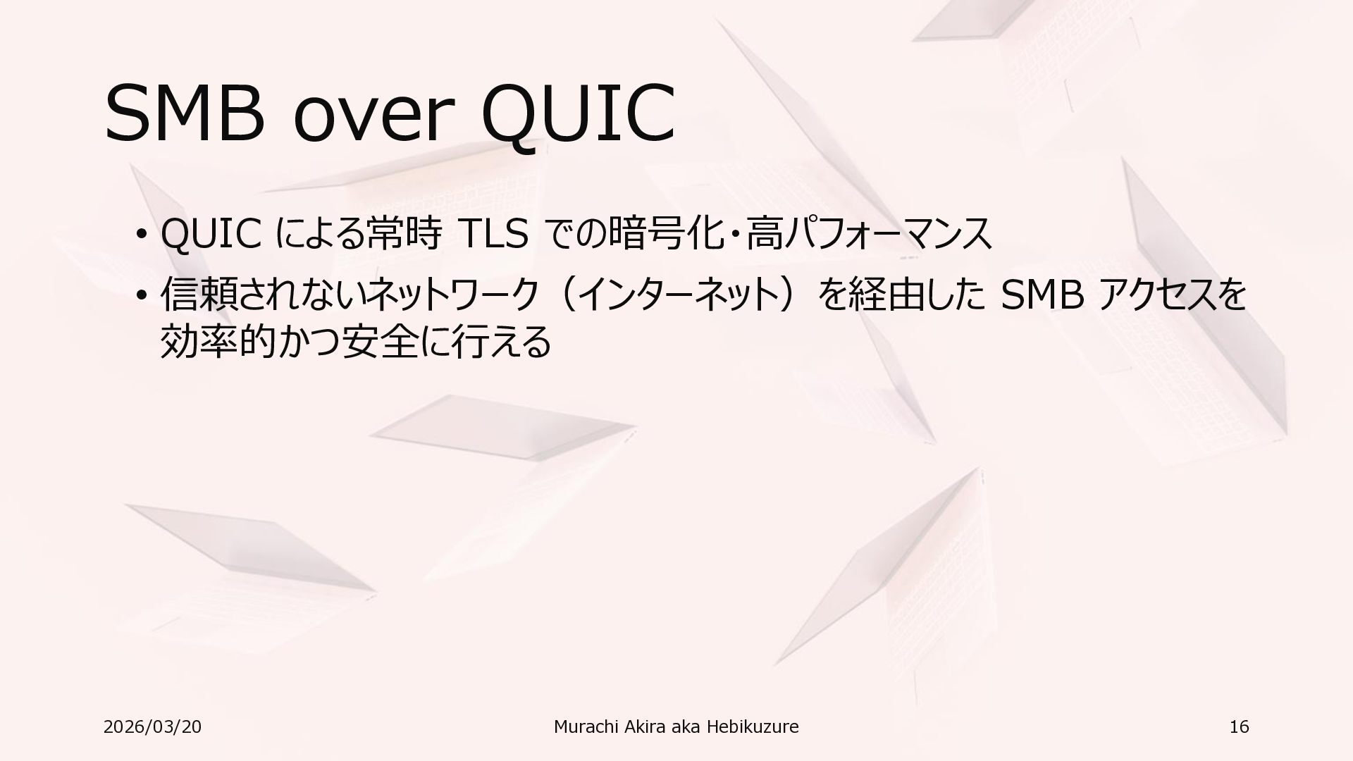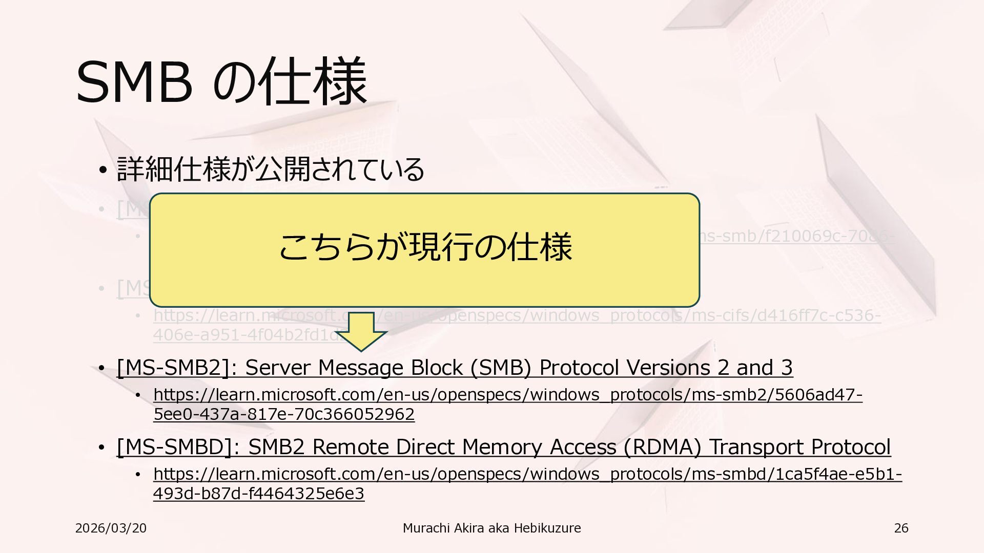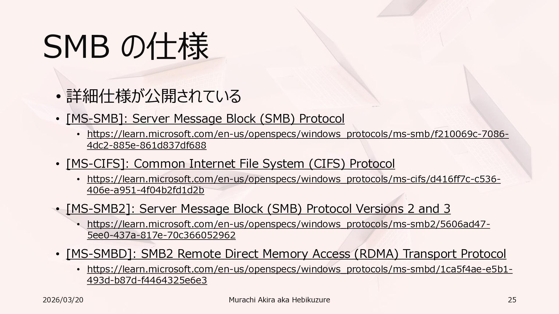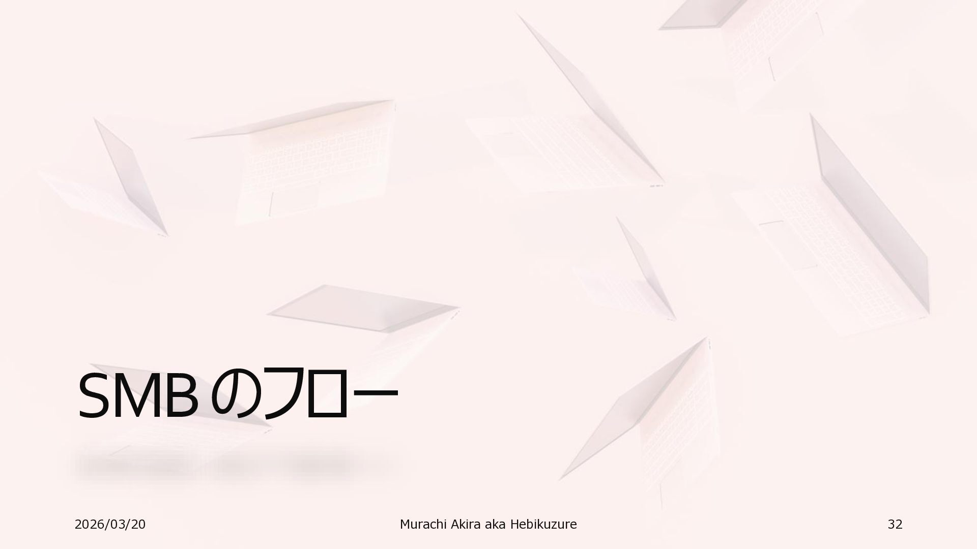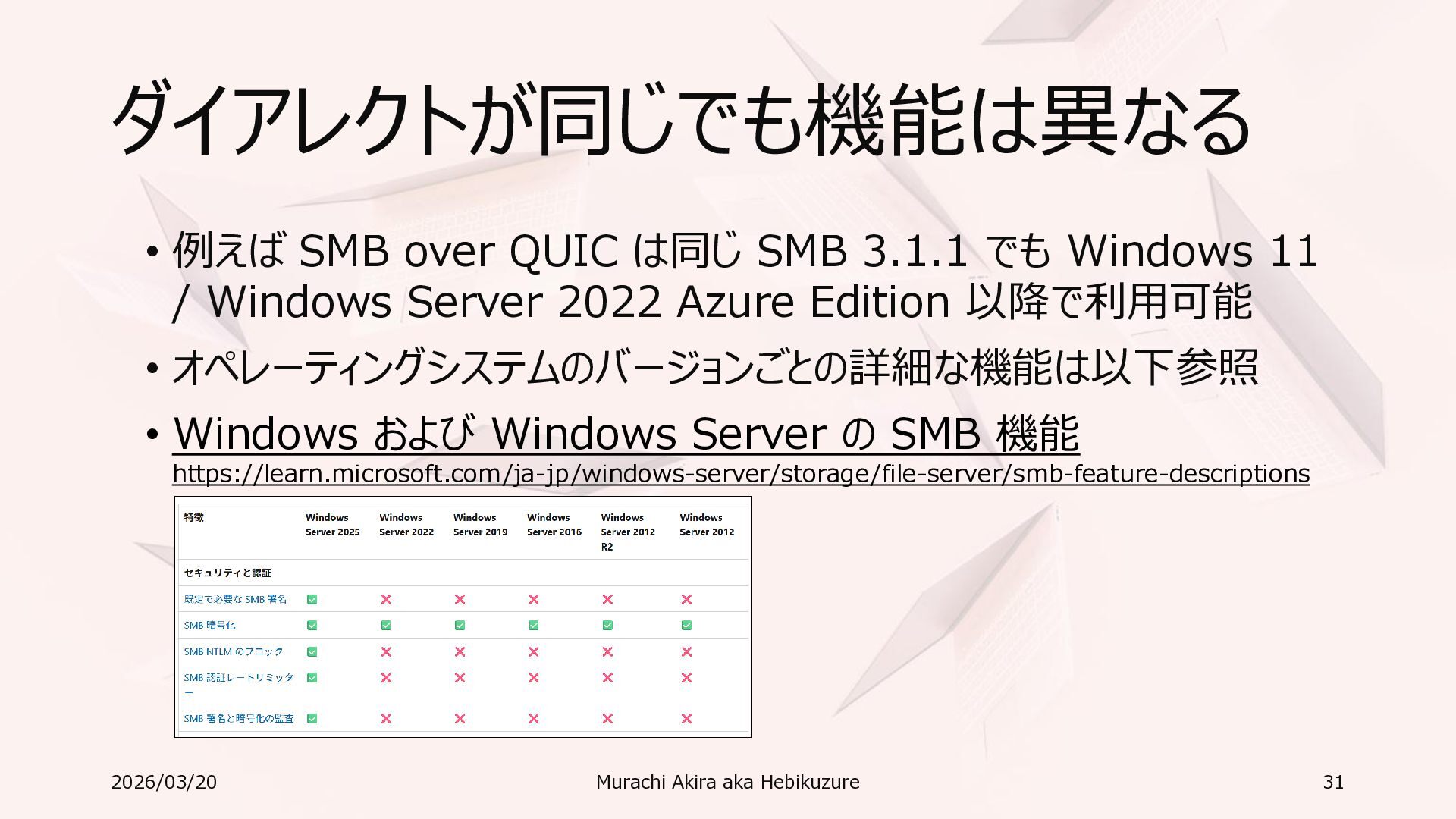 Windows 11 / Windows Server 2022 Azure Edition 以降で利用可能 • オペレーティングシステムのバージョンごとの詳細な機能は以下参照 • Windows および Windows Server の SMB 機能 https://learn.microsoft.com/ja-jp/windows-server/storage/file-server/smb-feature-descriptions 2026/03/20 Murachi Akira aka Hebikuzure 31