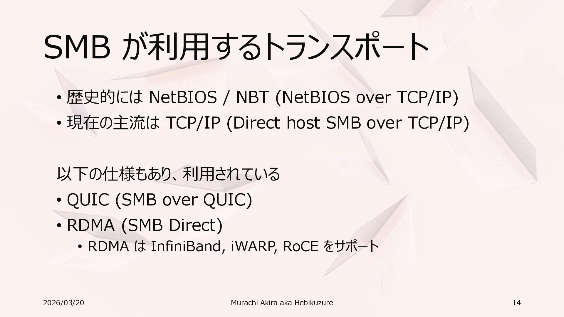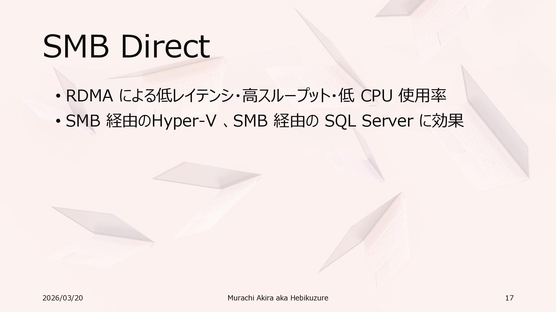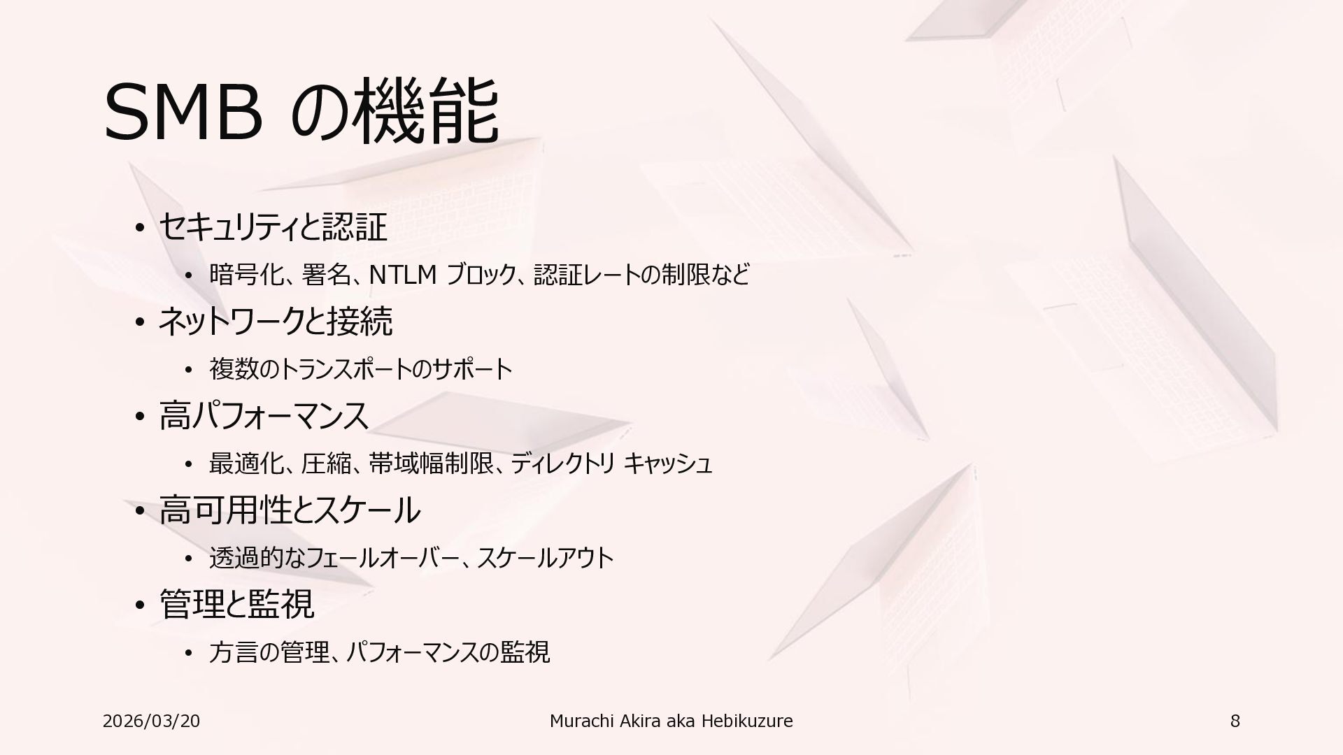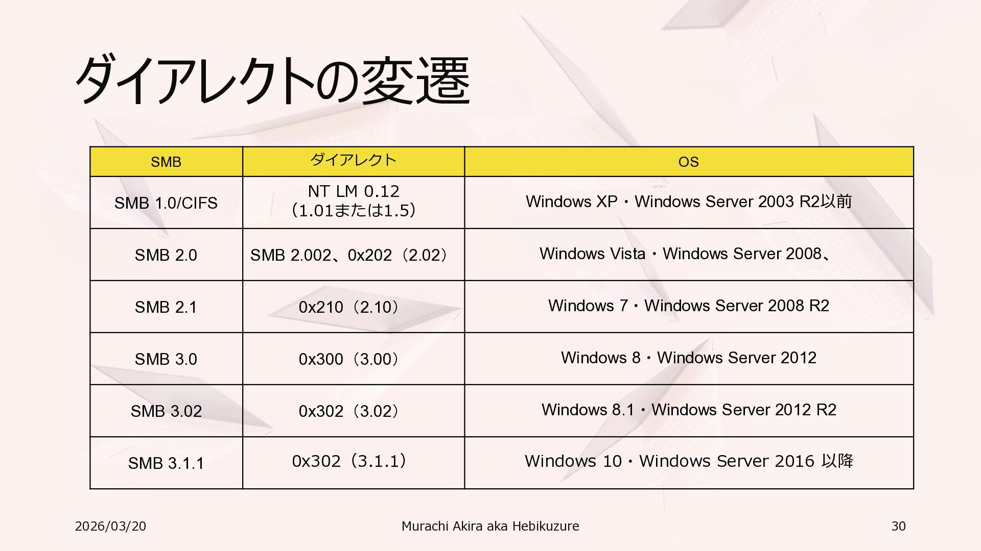 Windows 11 / Windows Server 2022 Azure Edition 以降で利用可能 • オペレーティングシステムのバージョンごとの詳細な機能は以下参照 • Windows および Windows Server の SMB 機能 https://learn.microsoft.com/ja-jp/windows-server/storage/file-server/smb-feature-descriptions 2026/03/20 Murachi Akira aka Hebikuzure 31