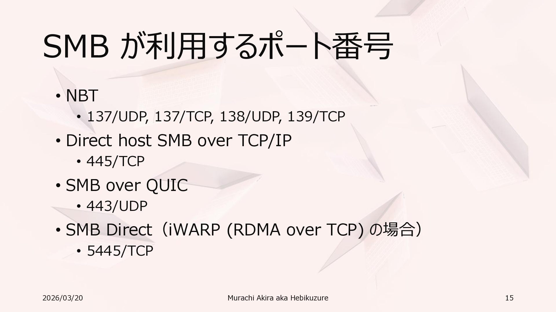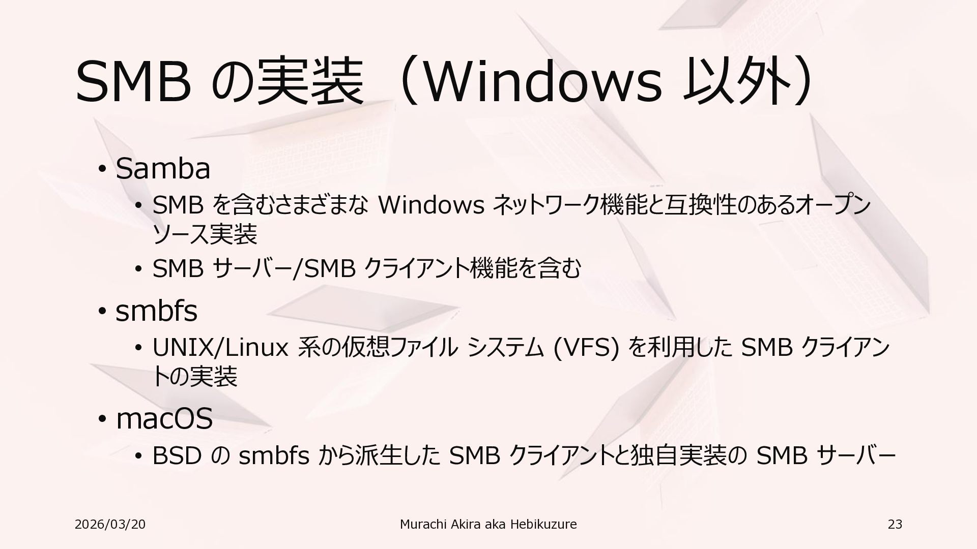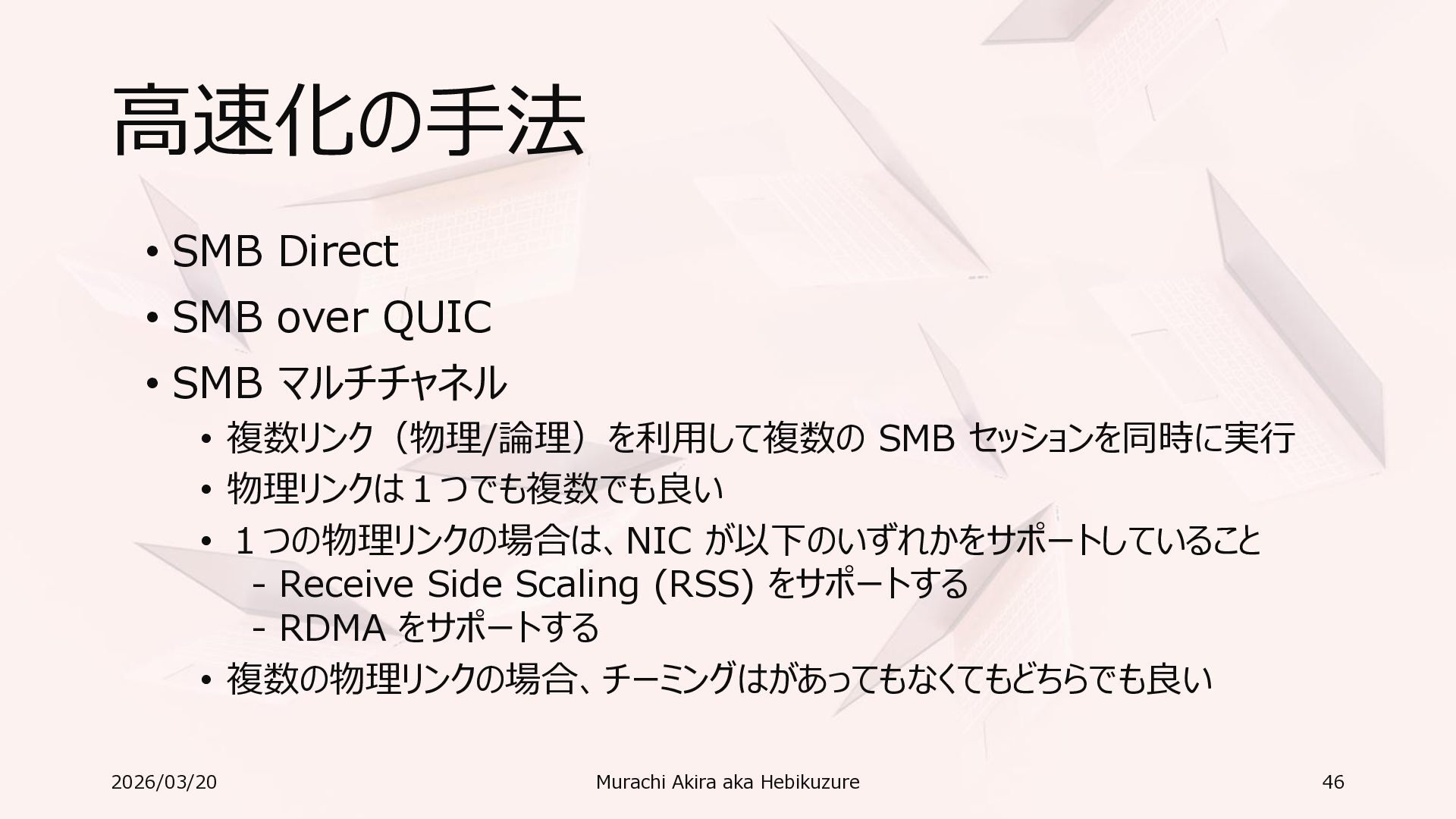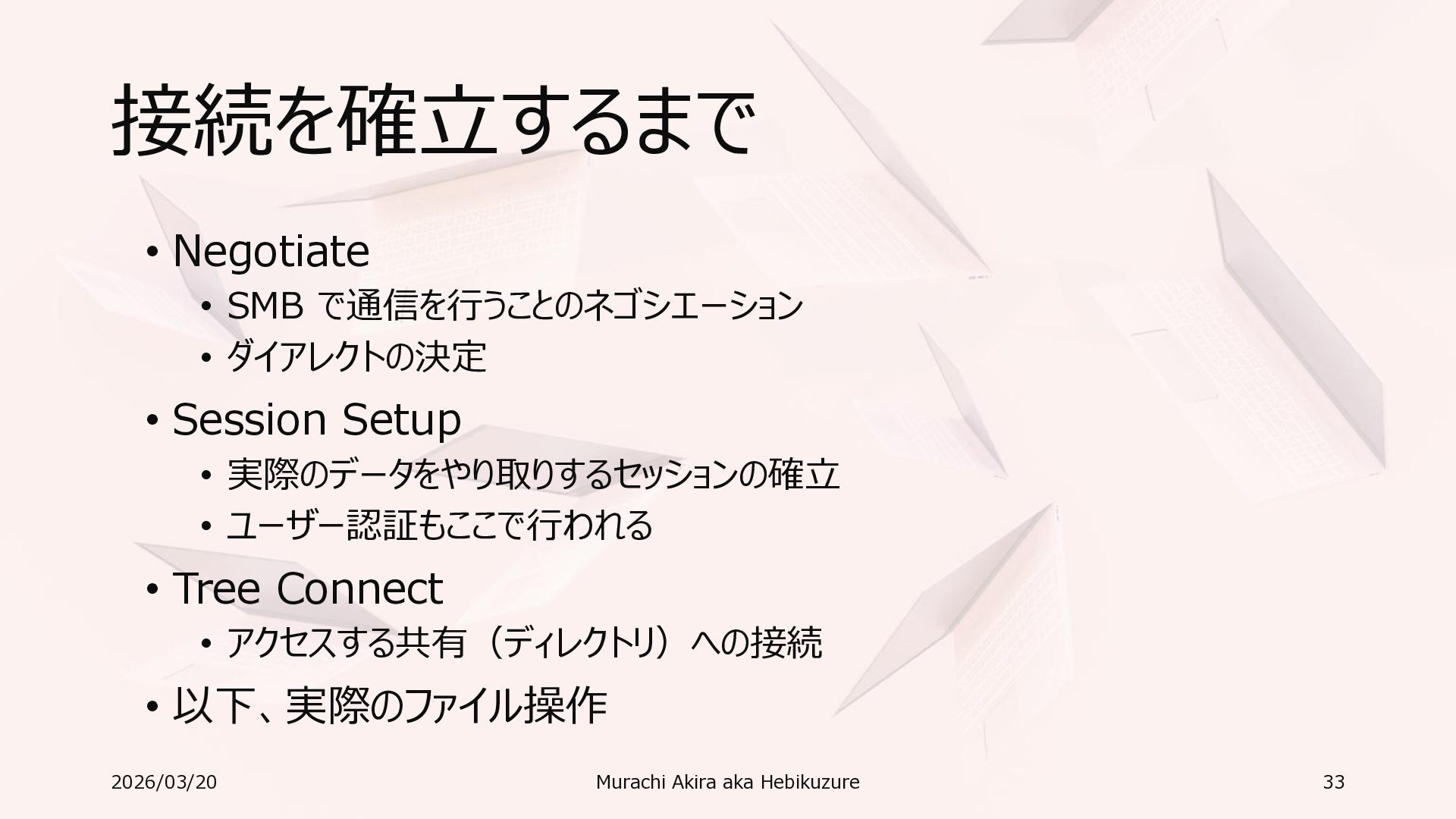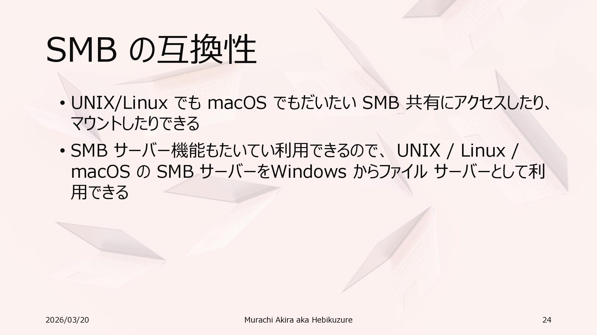 Windows 11 / Windows Server 2022 Azure Edition 以降で利用可能 • オペレーティングシステムのバージョンごとの詳細な機能は以下参照 • Windows および Windows Server の SMB 機能 https://learn.microsoft.com/ja-jp/windows-server/storage/file-server/smb-feature-descriptions 2026/03/20 Murachi Akira aka Hebikuzure 31
