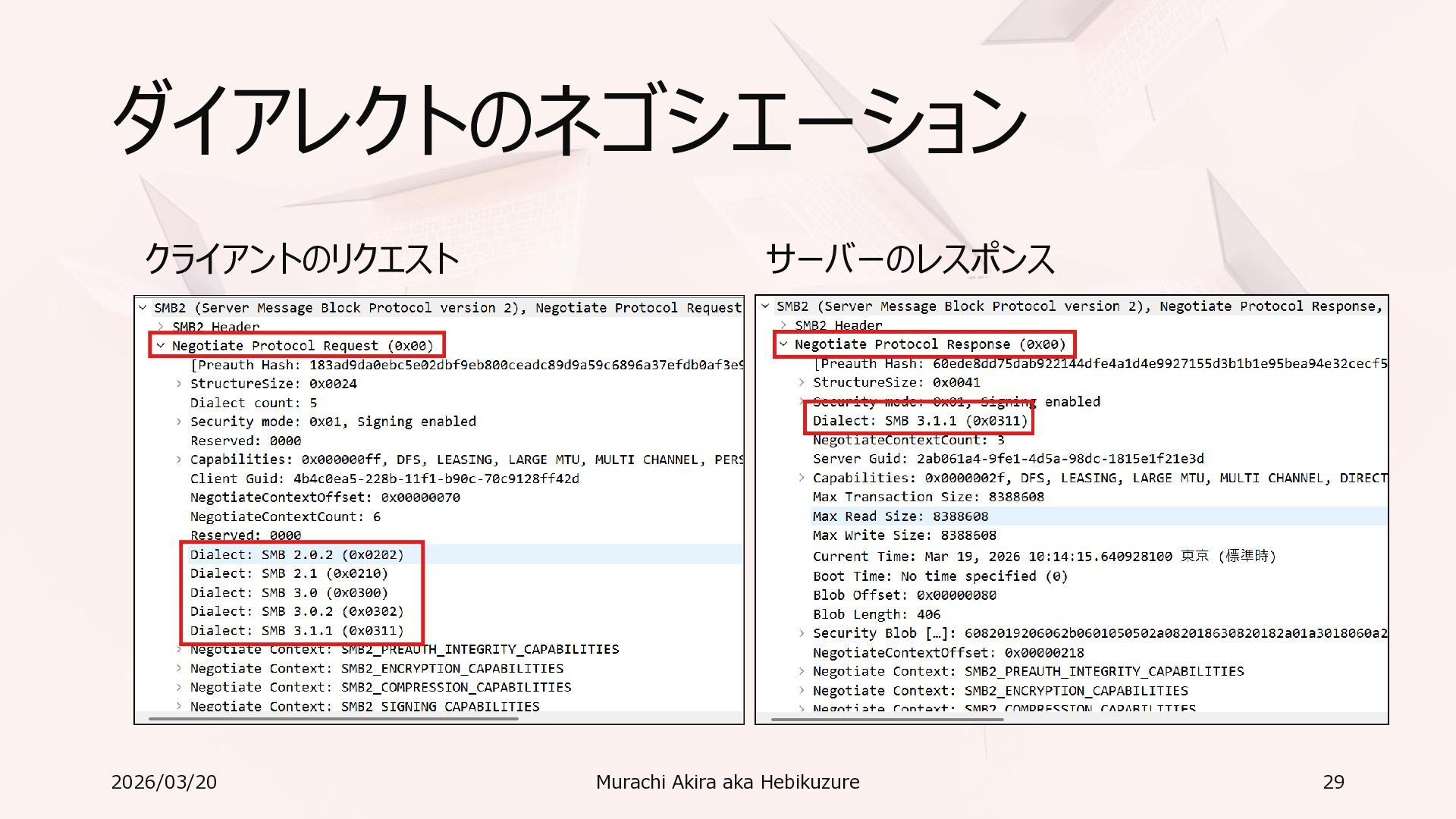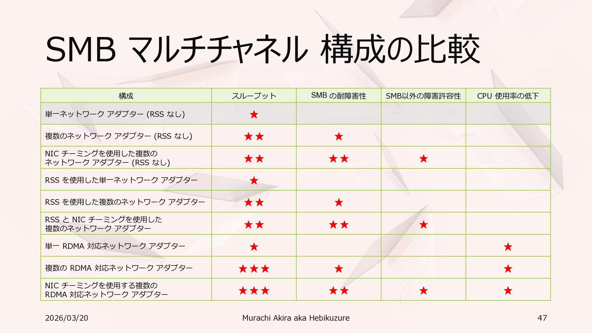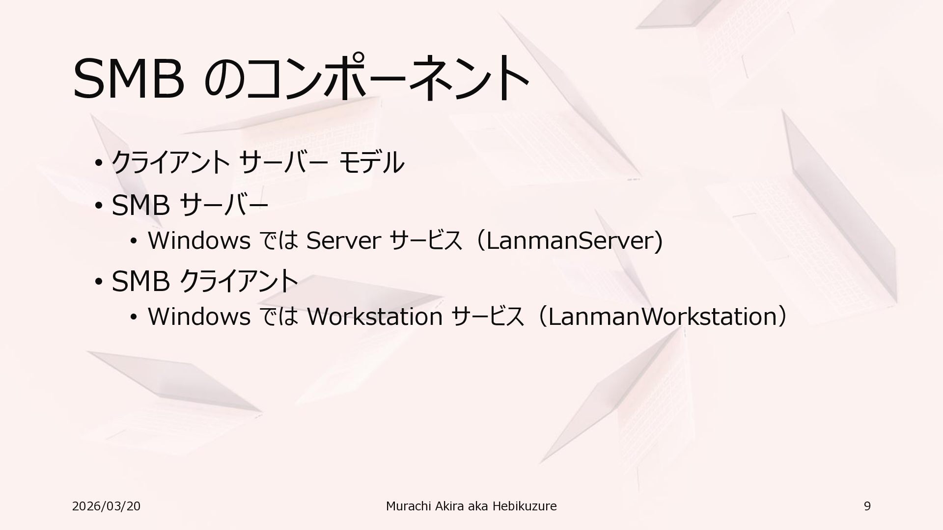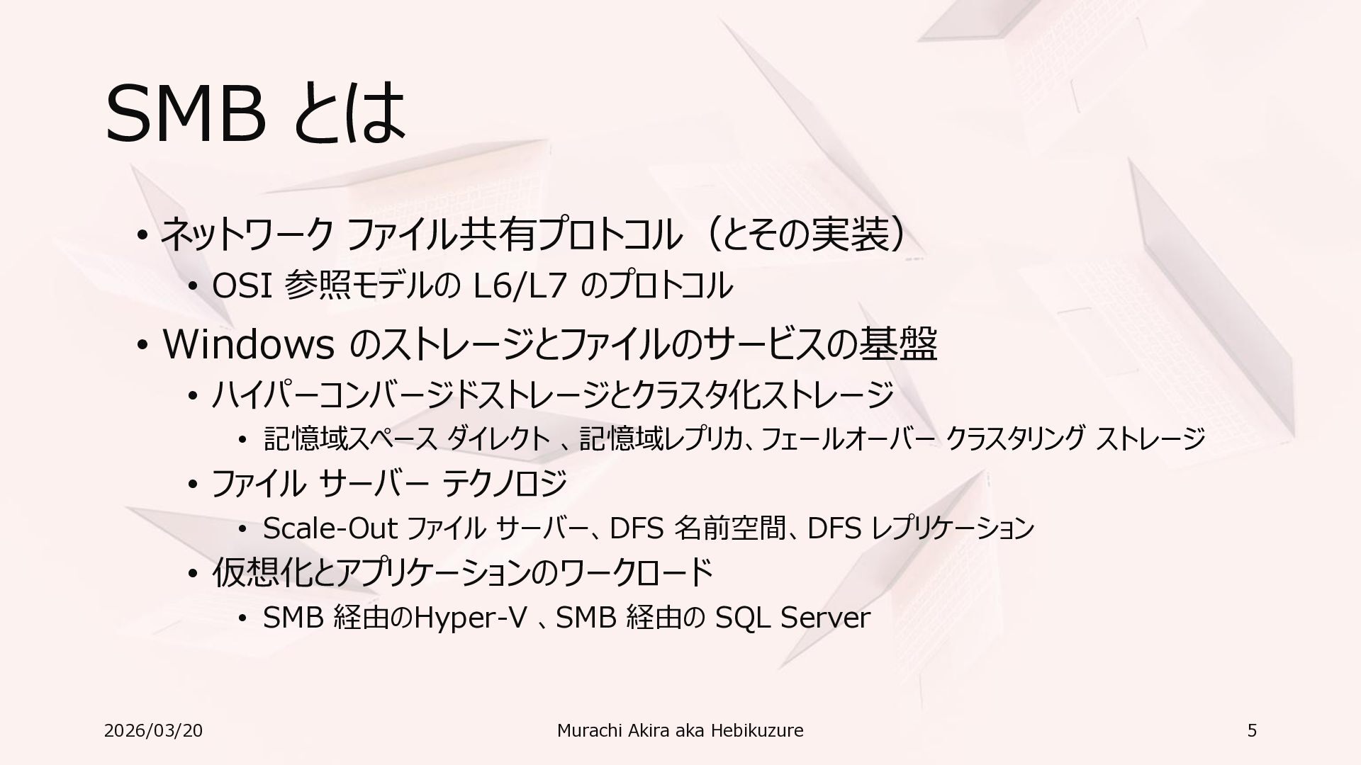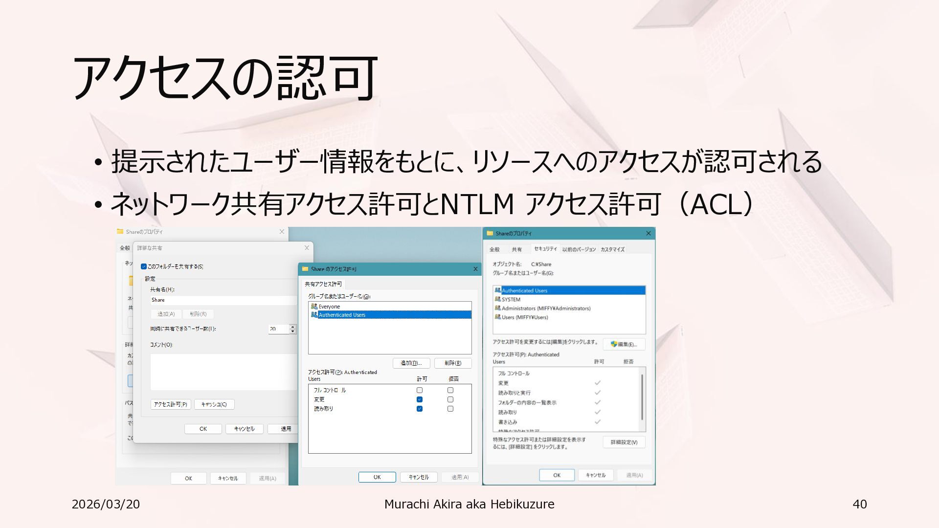 Windows 11 / Windows Server 2022 Azure Edition 以降で利用可能 • オペレーティングシステムのバージョンごとの詳細な機能は以下参照 • Windows および Windows Server の SMB 機能 https://learn.microsoft.com/ja-jp/windows-server/storage/file-server/smb-feature-descriptions 2026/03/20 Murachi Akira aka Hebikuzure 31