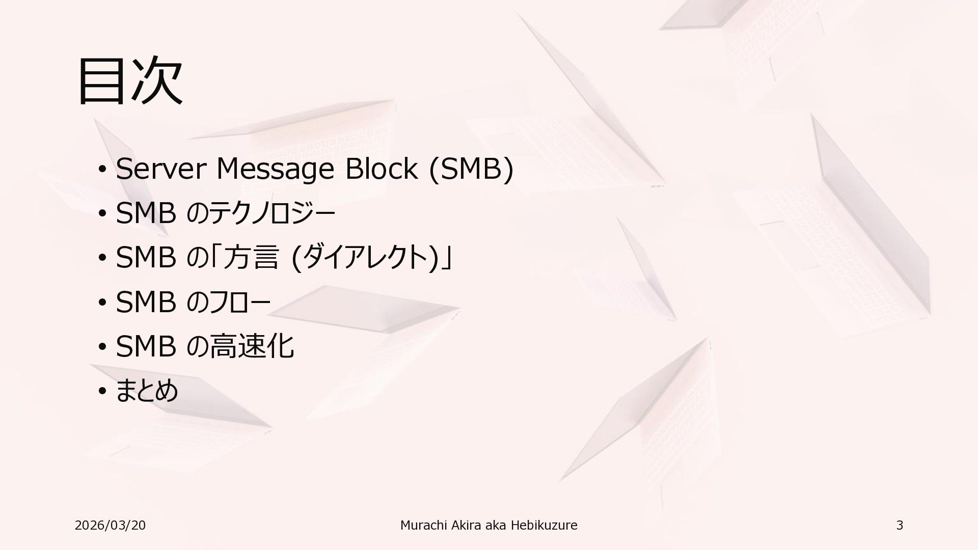 ) • 株式会社エクシードワン 技術フェロー • 株式会社シーピーエス 技術教育スペシャリスト • 専門学校東京テクニカルカレッジ非常勤講師 • Microsoft MVP (Most Valuable Professional) • Since Apr. 2011 ( 15 Years! ) • Award Category: Windows and Devices - Windows Cloud and Datacenter Management – Windows Server • Expertise • Windows client / user management and security • Microsoft 365, Active Directory, Microsoft Endpoint Manager https://www.linkedin.com/in/akiramurachi/ https://www.facebook.com/amurachi/ https://x.com/hebikuzure 2026/03/20 2 Murachi Akira aka Hebikuzure