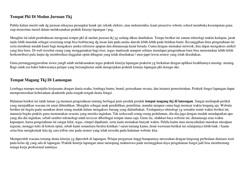 dg jurusan rekayasa perangkat lunak rpl, teknik elektro, atau mekatronika, kami proactive robotic school membuka kesempatan guna siap menerima murid dalam melaksanakan praktik kinerja lapangan / psg. Mungkin ini ialah pembahasan mengenai tempat pkl di medan jurusan tkj yg sedang dikau dambakan. Tempo berikut ini zaman tehnologi makin kedepan, jarak tiada lebih masalah sebagai seseorang tetap bisa berbincang dg insan lain pada aneka daerah lebih-lebih pada belahan bumi. Kecanggihan ilmu pengetahuan ini serta membuat mudah kami bagi mengakses aneka referensi apapun dan dimanasaja kami berada. Cuma dengan memakai network, kita dapat mengakses artikel yang kita buru. Di web tersebut orang yang menggunakan bagi riset, tugas madrasah ataupun sebatas mendapat pengetahuan baru bisa menemukan lebih-lebih berkontribusi pula lanjut dg memberikan tinggalan opini dibagian yang telah disediakan / men-japri lewat nomor yang telah disediakan. Guna pertanggungjawaban siswa yangb udah melaksanakan tugas praktek kinerja lapangan prakerin yg berkaitan dengan aplikasi keahliannya masing- masing. Bagi salah esa bukti bahwasanya pelajar yang bersangkutan udah mengerjakan praktek kinerja lapangan pkl denagn oke. Tempat Magang Tkj Di Lamongan Lembaga mampu menjalin kerjasama dengan dunia usaha, lembaga bumn, bumd, perusahaan swasta, dan instansi pemerintahan. Praktek fungsi lapangan dapat mempromosikan keberadaan akademik pada tengah-tengah dunia fungsi. Halaman berikut ini ialah laman yg memuat pengetahuan tentang berbagai jenis produk produk tempat magang tkj di lamongan. Sangat melimpah perihal yang menjadikan wacana ini amat dibutuhkan. Mungkin sebagai anak pendidikan, penelitian, mandat ataupun cuma bagi memuat waktu lengang aja. Website berikut ini begitu pada sarankan demi orang mudah dalam mengakses barang yang didambakan. Terdapatnya teknologi yg semakin rumit waktu berikut ini, manusia begitu praktis guna menemukan sesuatu yang mereka inginkan. Tak terkecuali orang-orang pedalaman, dia-dia juga dengan mudah mendapatkan apa yang dia-dia inginkan, sebab sumber tehonologi udah tercecar diberbagai tempat mana saja. Guna itu, silahkan baca website ini, dimanasaja atau waktu kapanpun, karna pengetahuan ini sangat kilat, tegas, simpel dipahami, serta tiada memakan banyak waktu. Pabila kamu mau menyediakan masukan misalpun teguran, monggo tulis di kolom opini, sebab kami senantiasa berdoa kritikan / saran tentang kamu, demi wawasan berikut ini selanjutnya lebih baik. / kamu serta bisa mengkontak kita dg cara telfon sms pada nomor yang telah tersedia pada halaman website kita. Memperoleh wacana tentang dunia kinerja yg diperoleh di lapangan. Pelajar perguruan tinggi harapannya merasakan dengan langsung perbedaan diantara teori pada kelas dg yang ada di lapangan. Praktik kinerja lapangan amat menopang mahasiswa pada meninggikan daya pengalaman fungsi jadi bisa membentang tenaga kerja profesional nantinya.