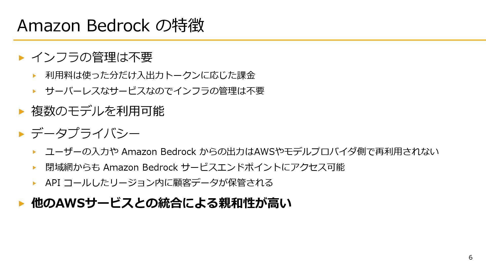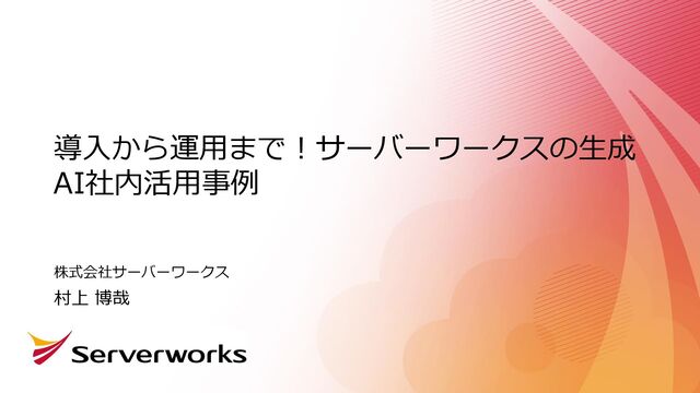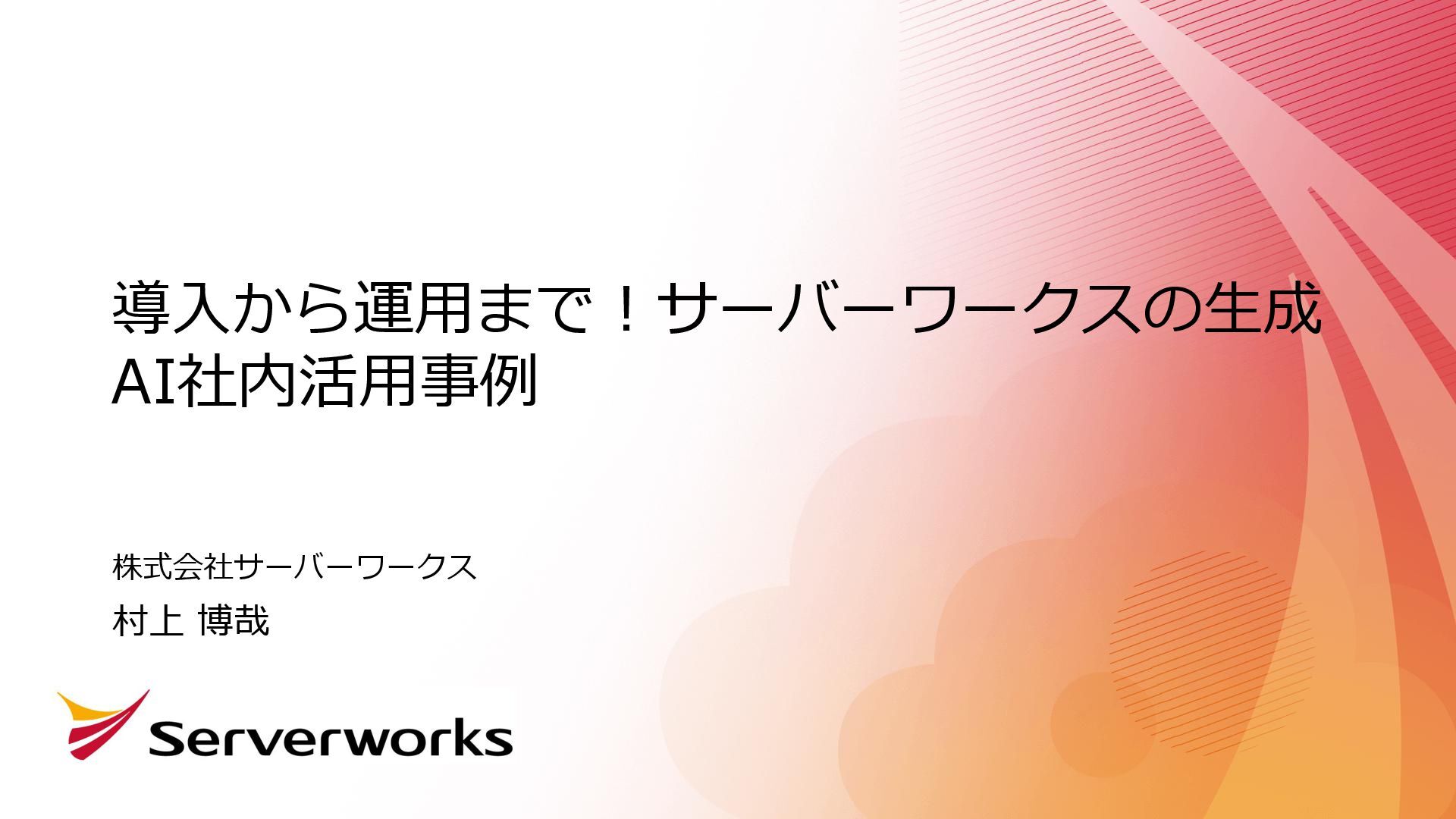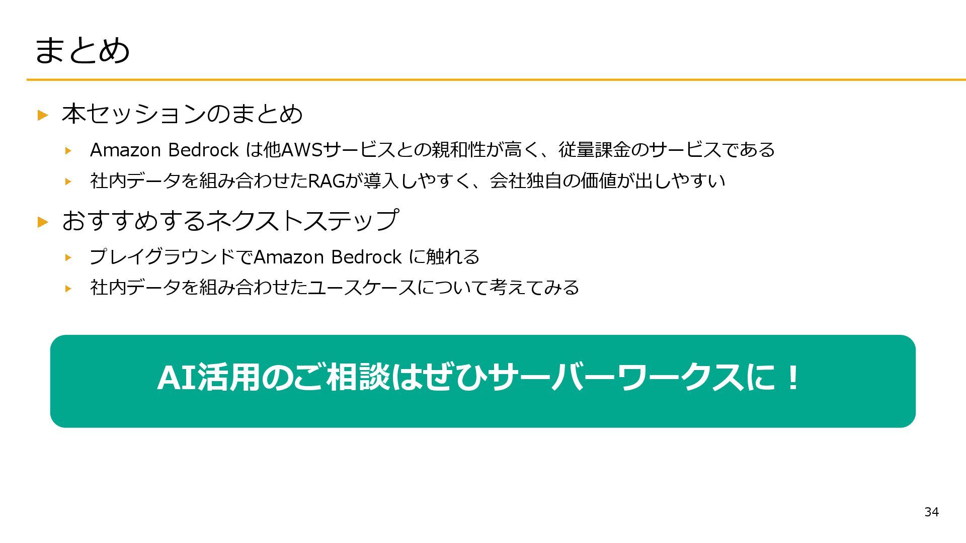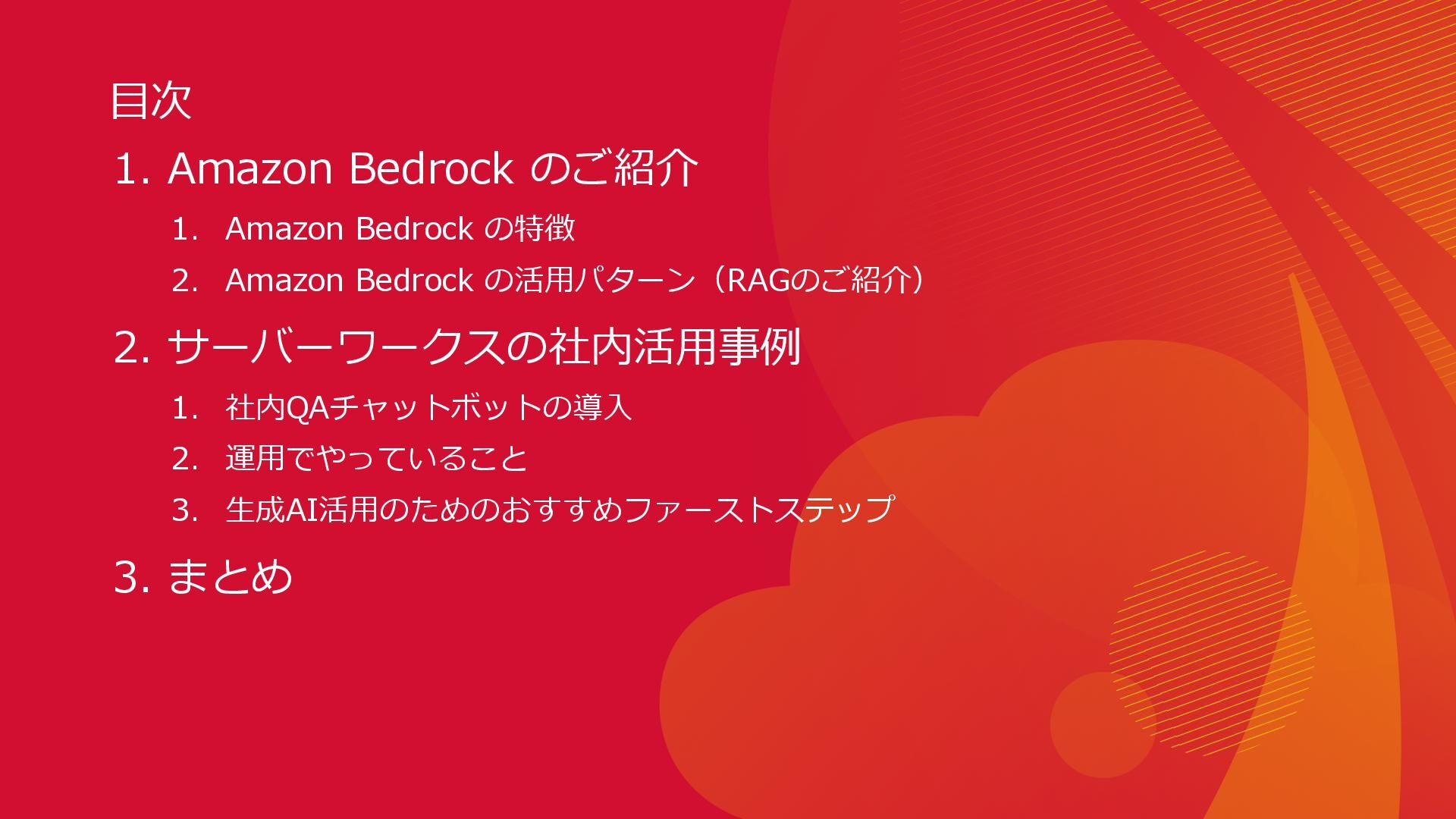 AWS Summit 2024のブースセッションにて登壇した資料です。 ・Amazon Bedrock のご紹介 ・サーバーワークスのRAG運用事例 ・生成AI活用のためのおすすめファーストステップ