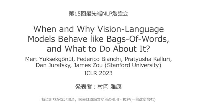 Mert Yüksekgönül, Federico Bianchi, Pratyusha Kalluri, Dan Jurafsky, and James Zou. When and Why Vision-Language Models Behave like Bags-Of-Words, and What to Do About It? (ICLR2023)