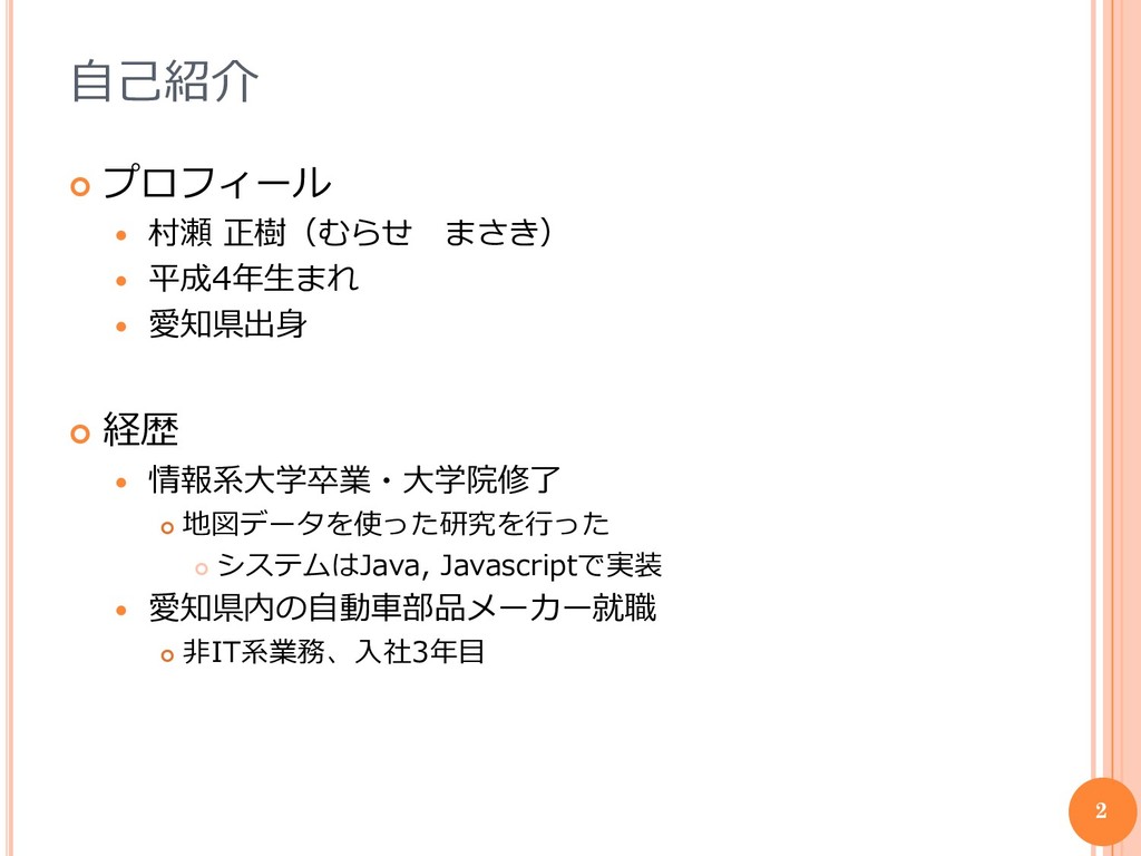 愛知県出身 経歴 情報系大学卒業・大学院修了 地図データを使った研究を行った システムはJava, Javascriptで実装 愛知県内の自動車部品メーカー就職 非IT系業務、入社3年目 2
