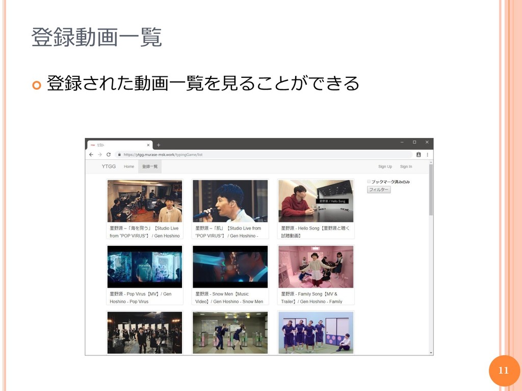 登録動画一覧 登録された動画一覧を見ることができる 11