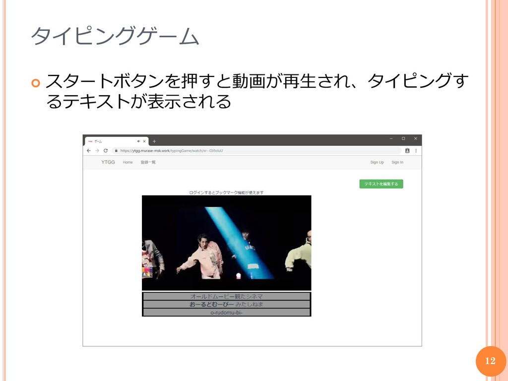 タイピングゲーム スタートボタンを押すと動画が再生され、タイピングす るテキストが表示される 12