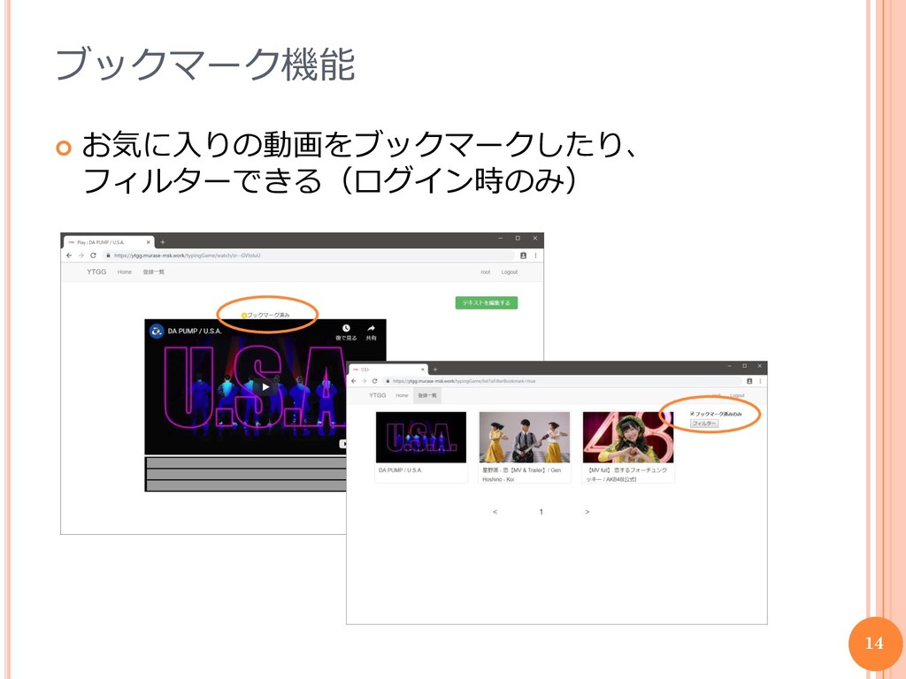 ブックマーク機能 お気に入りの動画をブックマークしたり、 フィルターできる(ログイン時のみ) 14