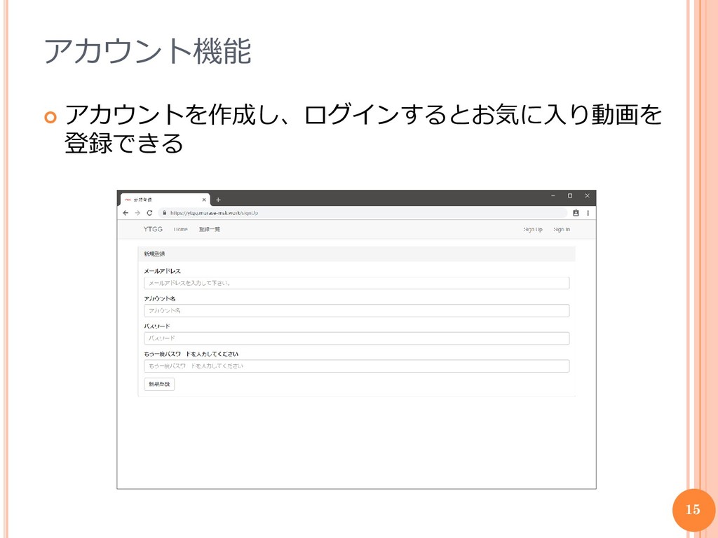 アカウント機能 アカウントを作成し、ログインするとお気に入り動画を 登録できる 15
