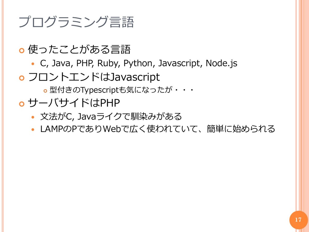 Node.js フロントエンドはJavascript 型付きのTypescriptも気になったが・・・ サーバサイドはPHP 文法がC, Javaライクで馴染みがある LAMPのPでありWebで広く使われていて、簡単に始められる 17