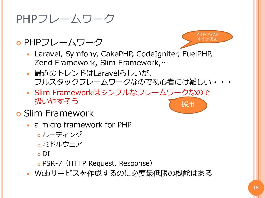 Framework, Slim Framework,… 最近のトレンドはLaravelらしいが、 フルスタックフレームワークなので初心者には難しい・・・ Slim Frameworkはシンプルなフレームワークなので 扱いやすそう Slim Framework a micro framework for PHP ルーティング ミドルウェア DI PSR-7(HTTP Request, Response) Webサービスを作成するのに必要最低限の機能はある 18 PHPのWAF 多すぎ問題 採用