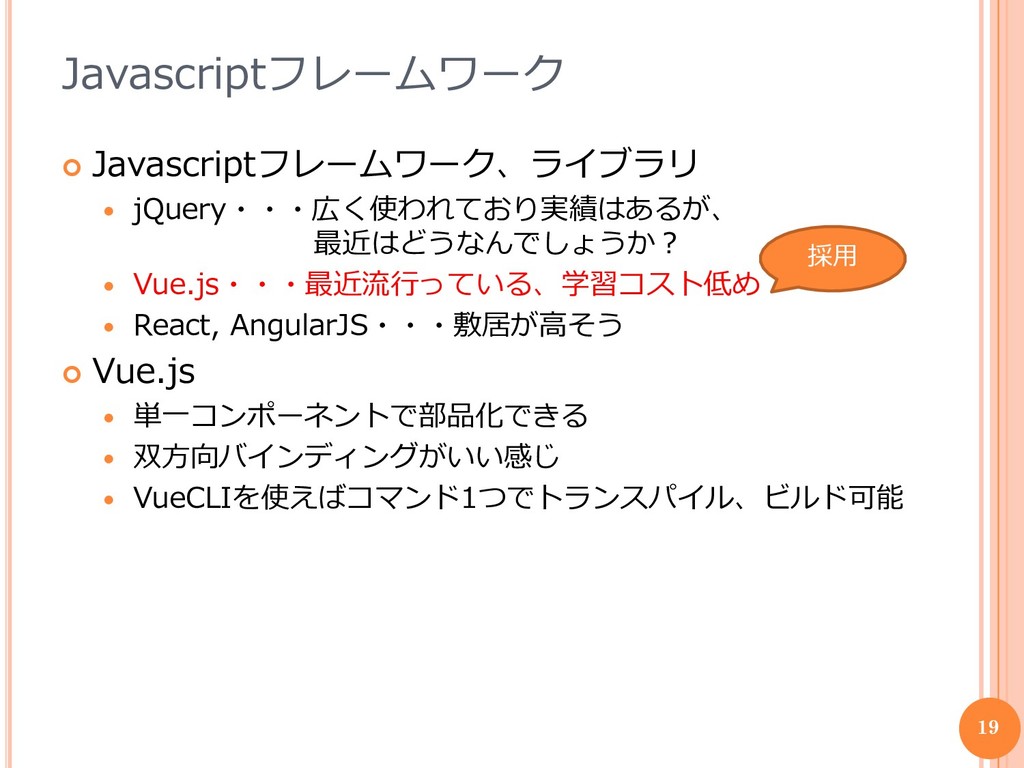 AngularJS・・・敷居が高そう Vue.js 単一コンポーネントで部品化できる 双方向バインディングがいい感じ VueCLIを使えばコマンド1つでトランスパイル、ビルド可能 19 採用