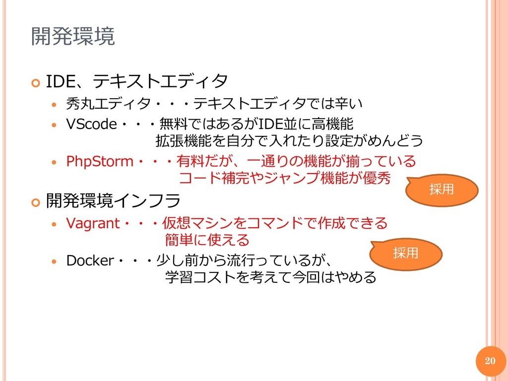 コード補完やジャンプ機能が優秀 開発環境インフラ Vagrant・・・仮想マシンをコマンドで作成できる 簡単に使える Docker・・・少し前から流行っているが、 学習コストを考えて今回はやめる 20 採用 採用