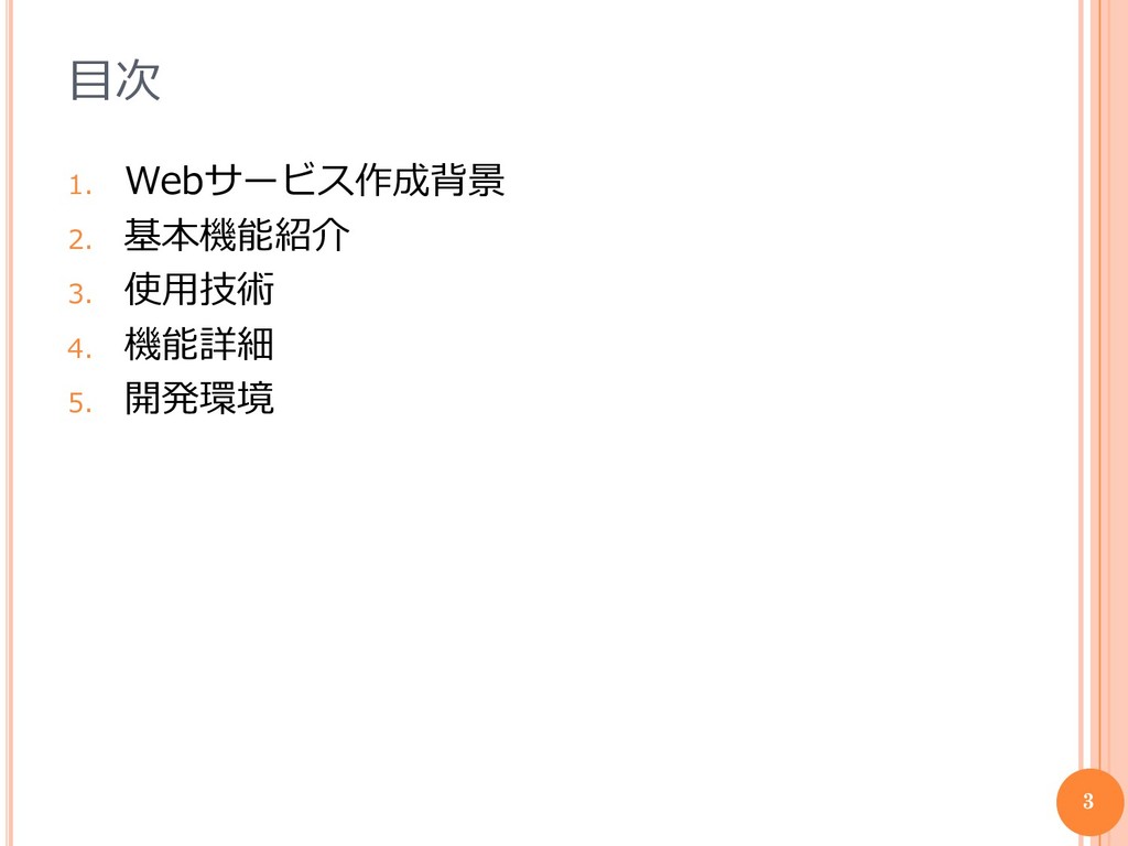 目次 1. Webサービス作成背景 2. 基本機能紹介 3. 使用技術 4. 機能詳細 5.