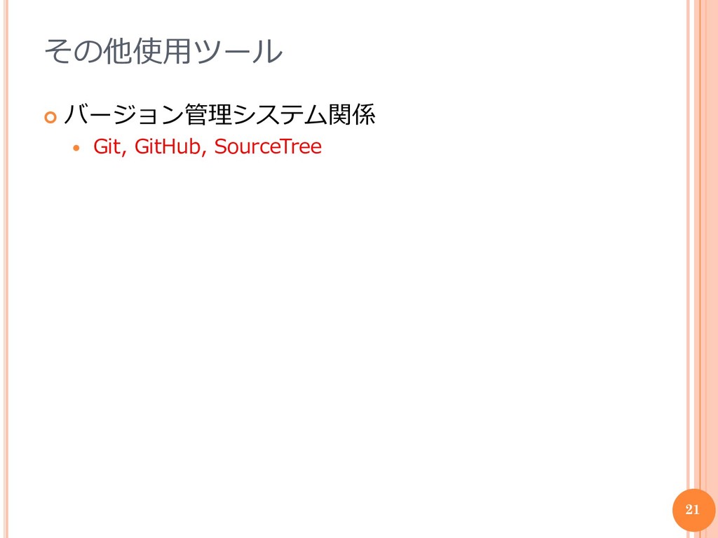 その他使用ツール バージョン管理システム関係 Git, GitHub, SourceTree 21