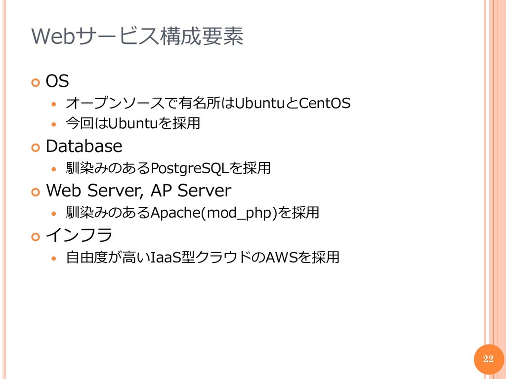 馴染みのあるPostgreSQLを採用 Web Server, AP Server 馴染みのあるApache(mod_php)を採用 インフラ 自由度が高いIaaS型クラウドのAWSを採用 22