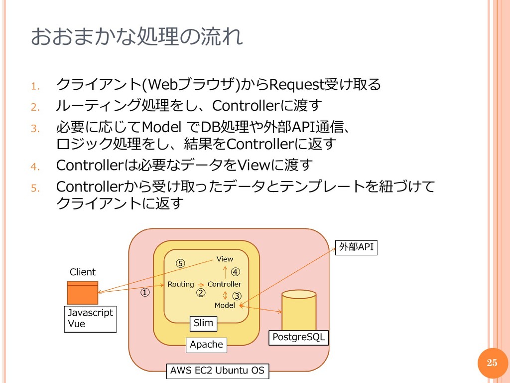 おおまかな処理の流れ 1. クライアント(Webブラウザ)からRequest受け取る 2. ルーティング処理をし、Controllerに渡す 3. 必要に応じてModel でDB処理や外部API通信、 ロジック処理をし、結果をControllerに返す 4.