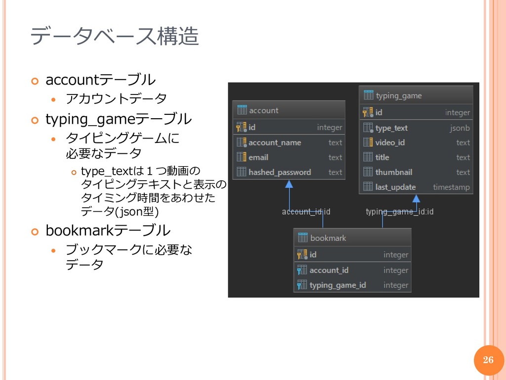 type_textは1つ動画の タイピングテキストと表示の タイミング時間をあわせた データ(json型) bookmarkテーブル ブックマークに必要な データ 26